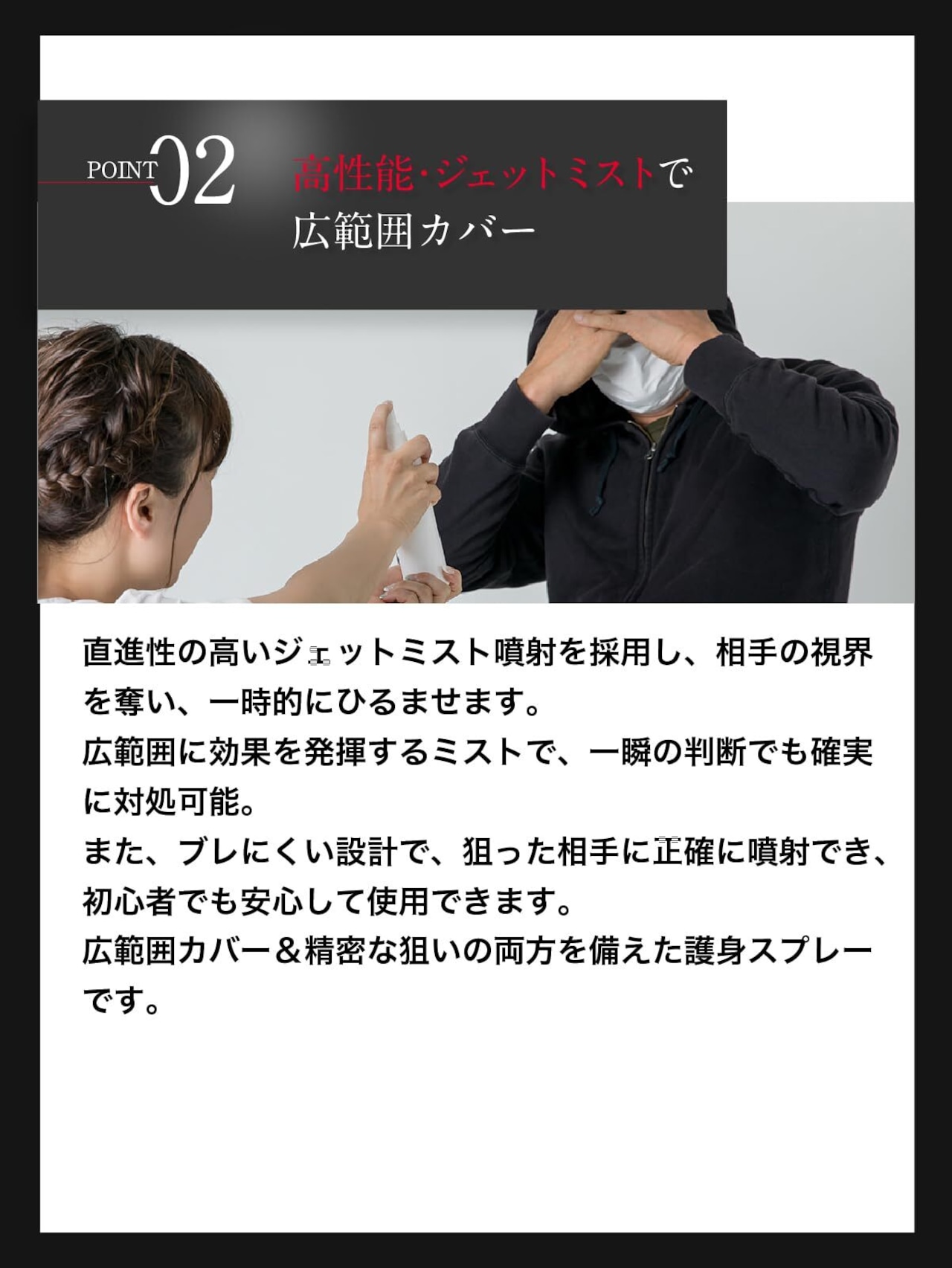【護身・防犯に特化したスプレー】機能性だけでなくデザイン性にもこだわった護身用スプレーです。シンプルでコンパクトサイズながら、強力な噴射力で緊急時にしっかり効果を発揮します。(専用ノズル!キャップはなく)軽く押すだけの簡単操作で、女性やご高齢の方でも安心してお使いいただけます。