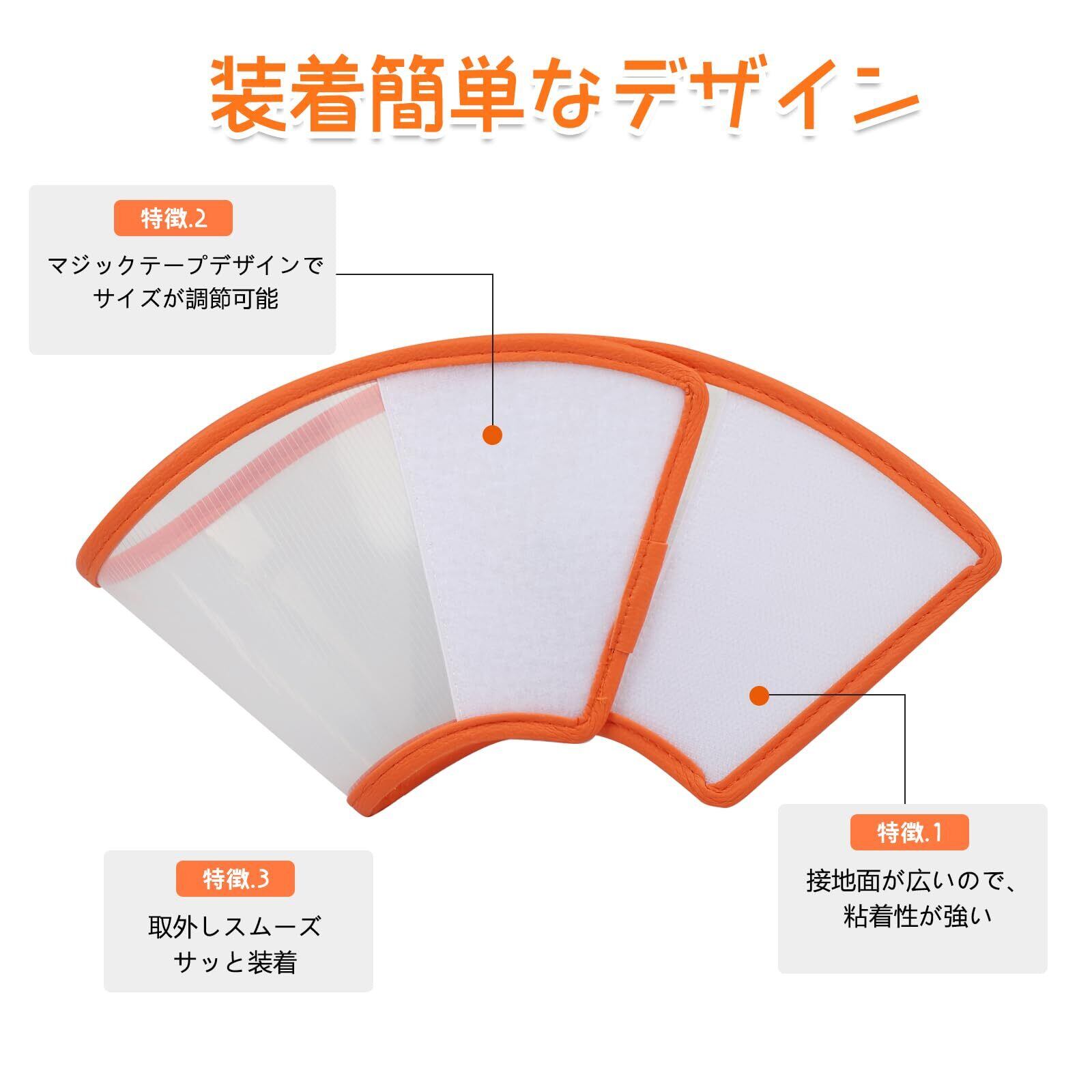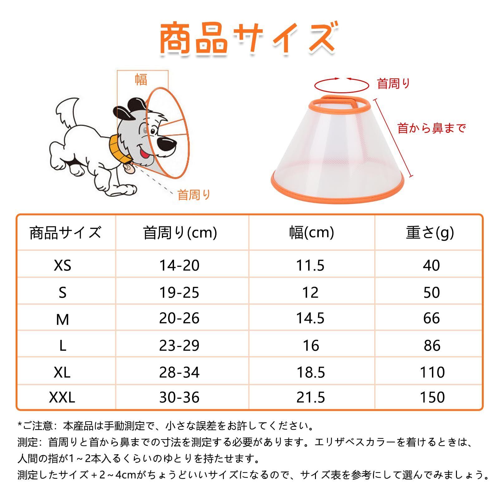 【※ご注意してください】:購入する前に正しいサイズを選んでください。フィットしたエリザベスカラーは、猫や犬にとってより効果的で快適です。測定:首周りと首から鼻までの寸法を測定する必要があります。*ご注意:エリザベスカラーを着けるときは、人間の指が1~2本入るくらいのゆとりを持たせます。測定したサイズ+2~4cmがちょうどいいサイズになるので、サイズ表を参考にして選んでみましょう。