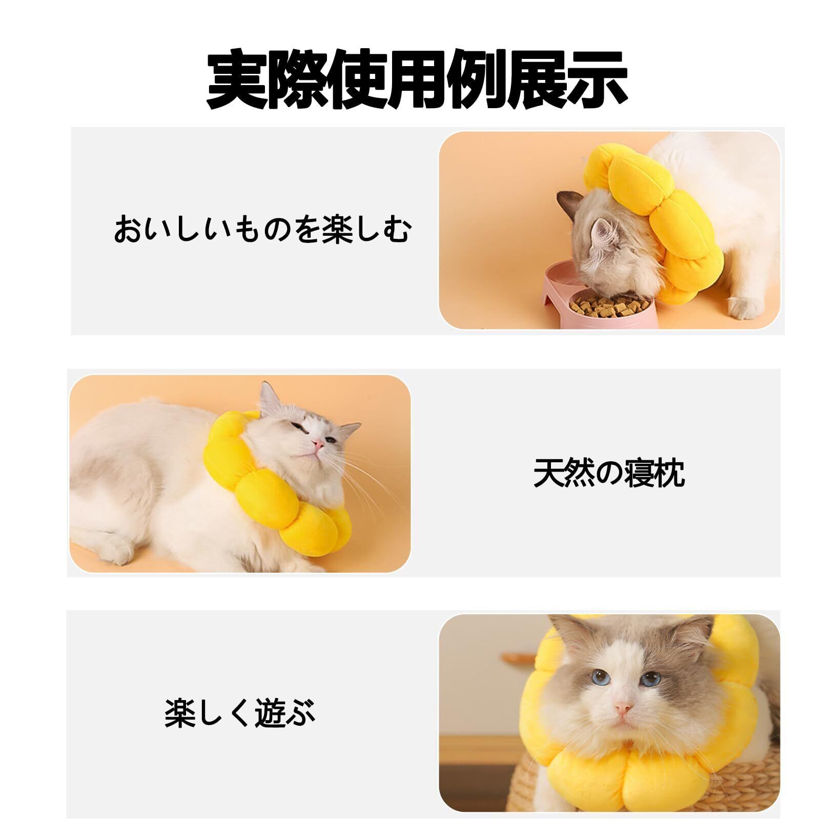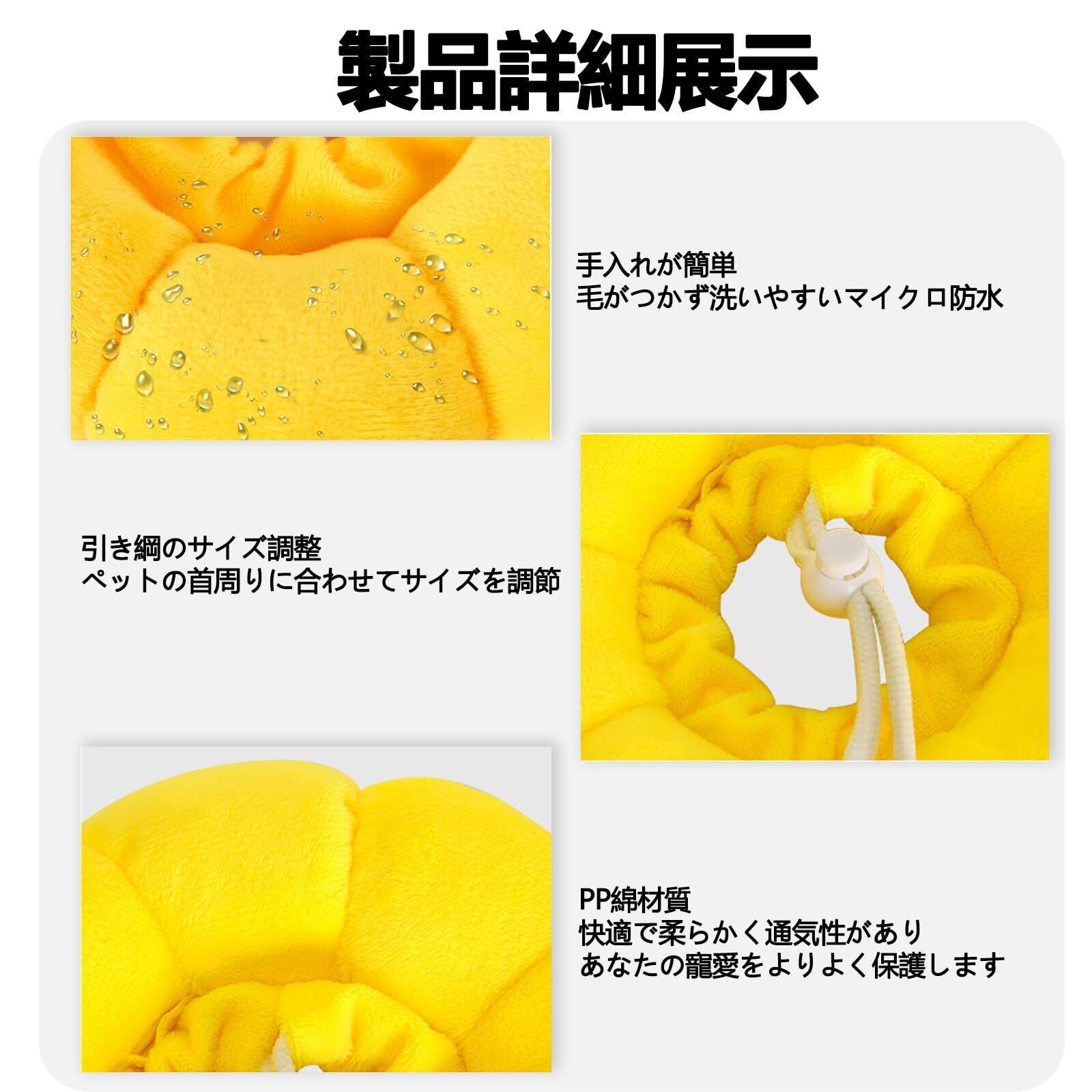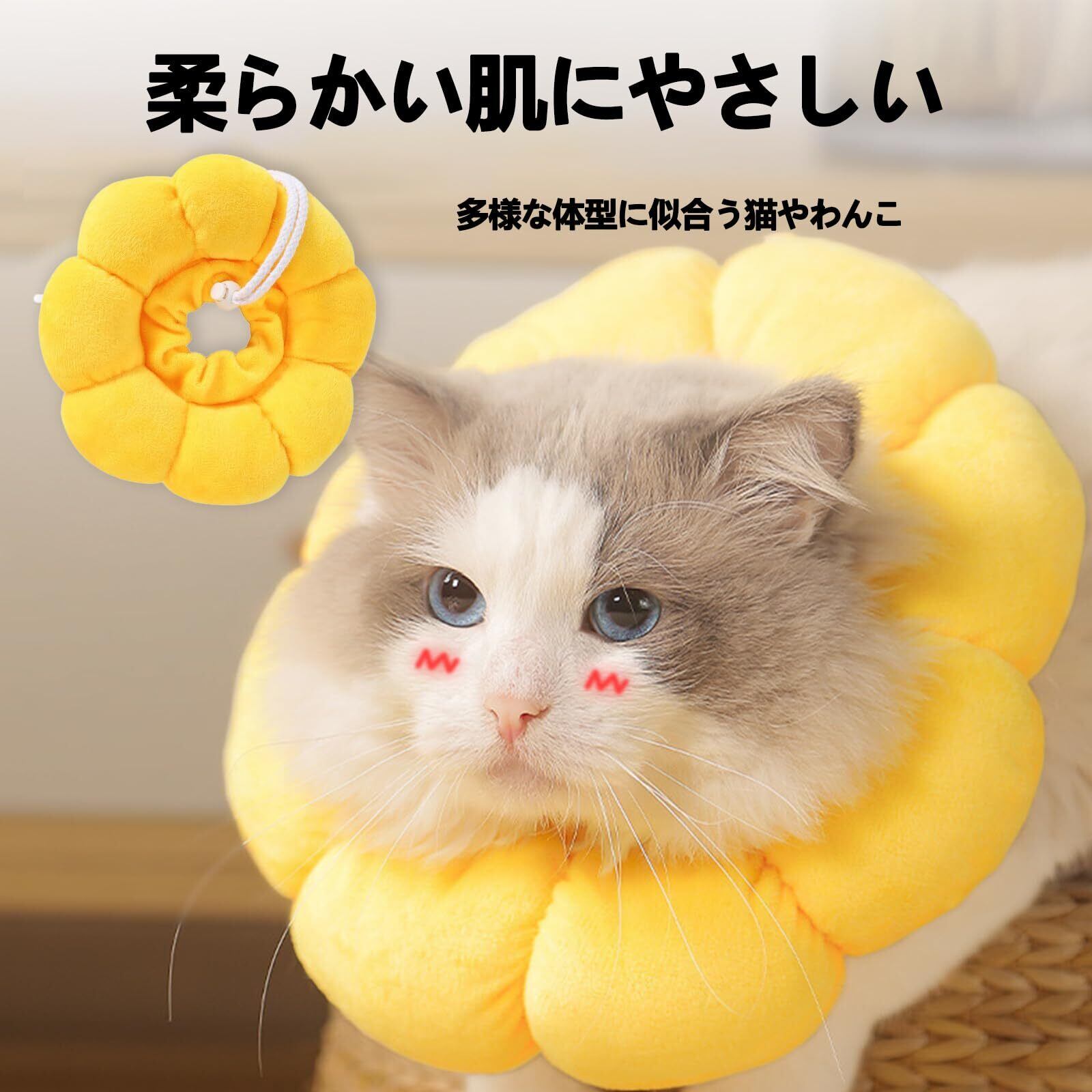 【可愛な外観】外観はひまわりの形で、明るい黄色です。活気に満ちたひまわりは、ペットの生活にさらに多彩な色彩を添えます。素材:PPコットン。猫や小型犬などに適しており、3つのサイズから選択可能です,S/M/L,首周が13-32センチの犬や猫に適しています。
