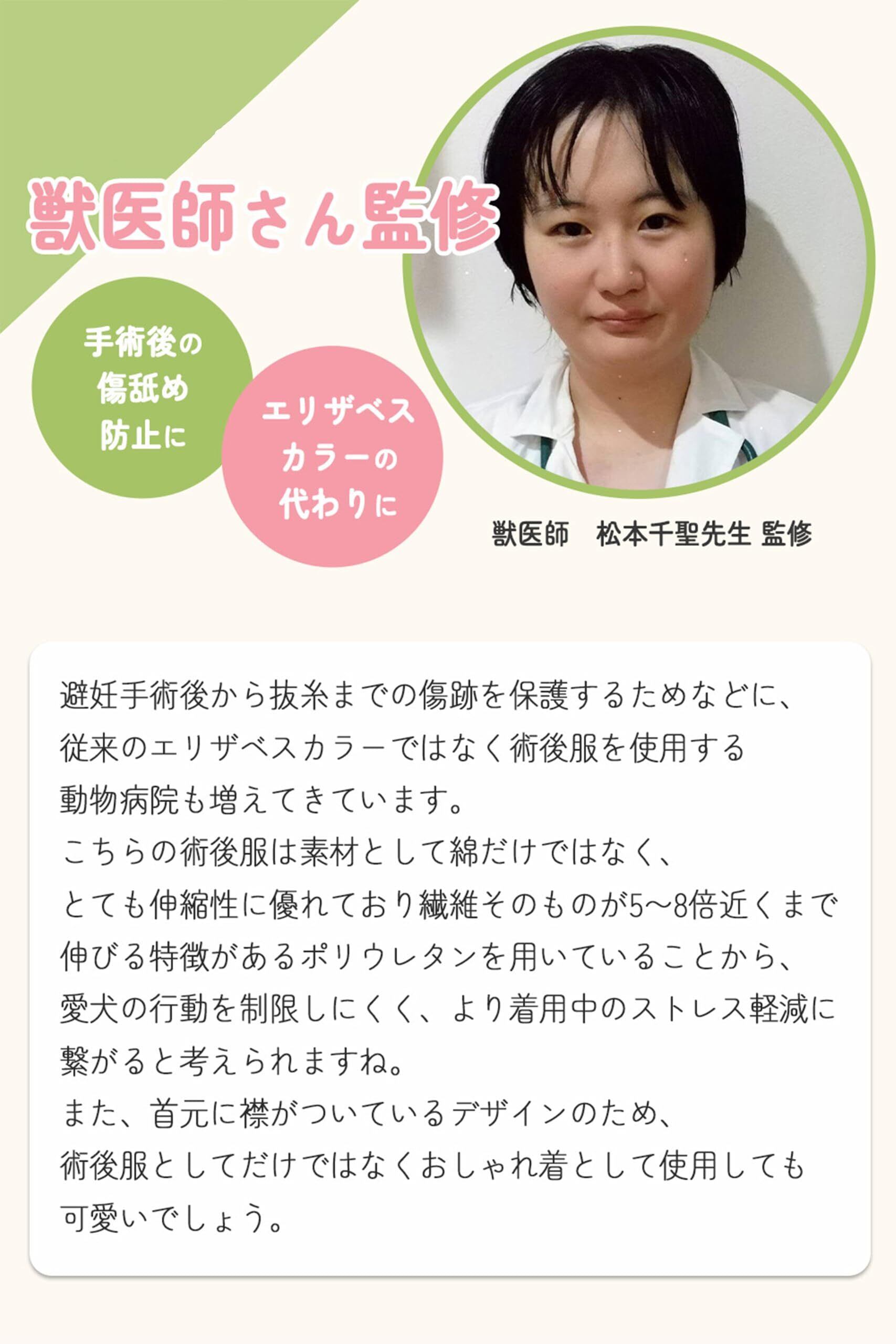 【獣医師監修の術後服】従来では,避妊手術などによる傷跡を保護するためにエリザベスカラーが使用されていましたが,動きが制限されワンちゃんへ負担がかかります。本製品は服を着せることによって,ワンちゃんの動きを制限することなく傷跡を保護します。