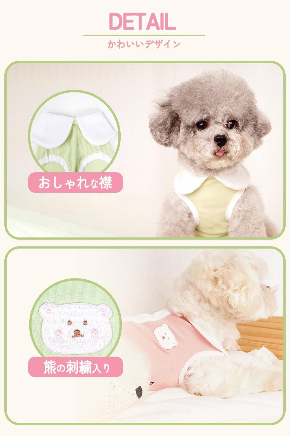 【ストレスフリーな着心地】本製品は伸縮性のある素材(綿95%とポリウレタン5%)で作製しており,他の商品(綿100%など)と比べワンちゃんの動きを妨げません。また通気性,吸収性にも優れています。