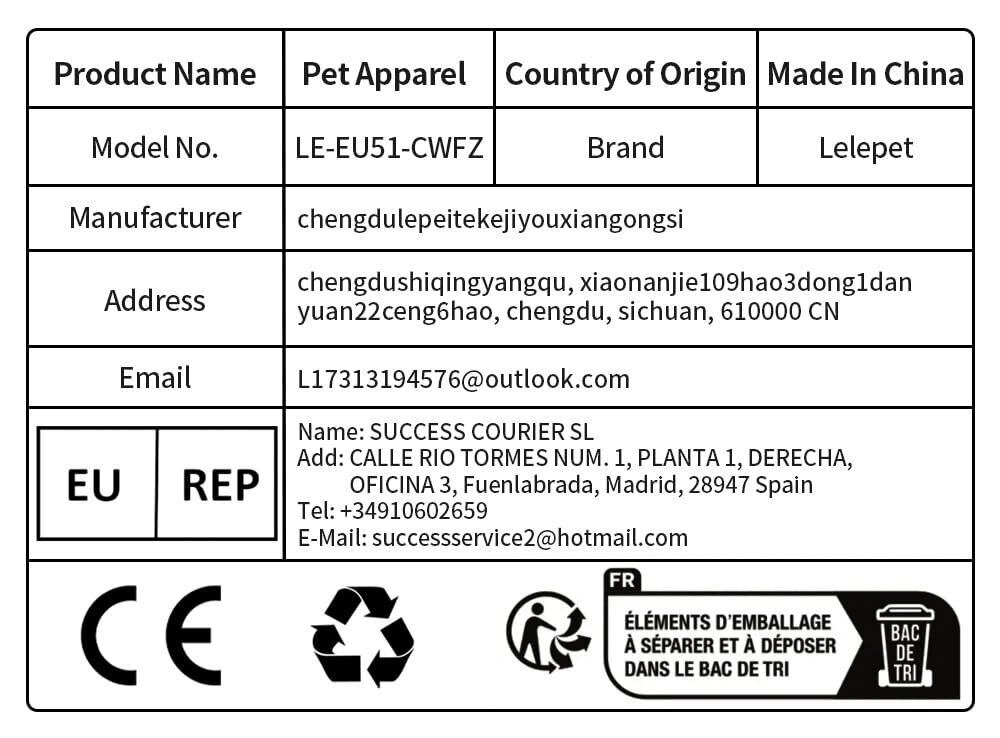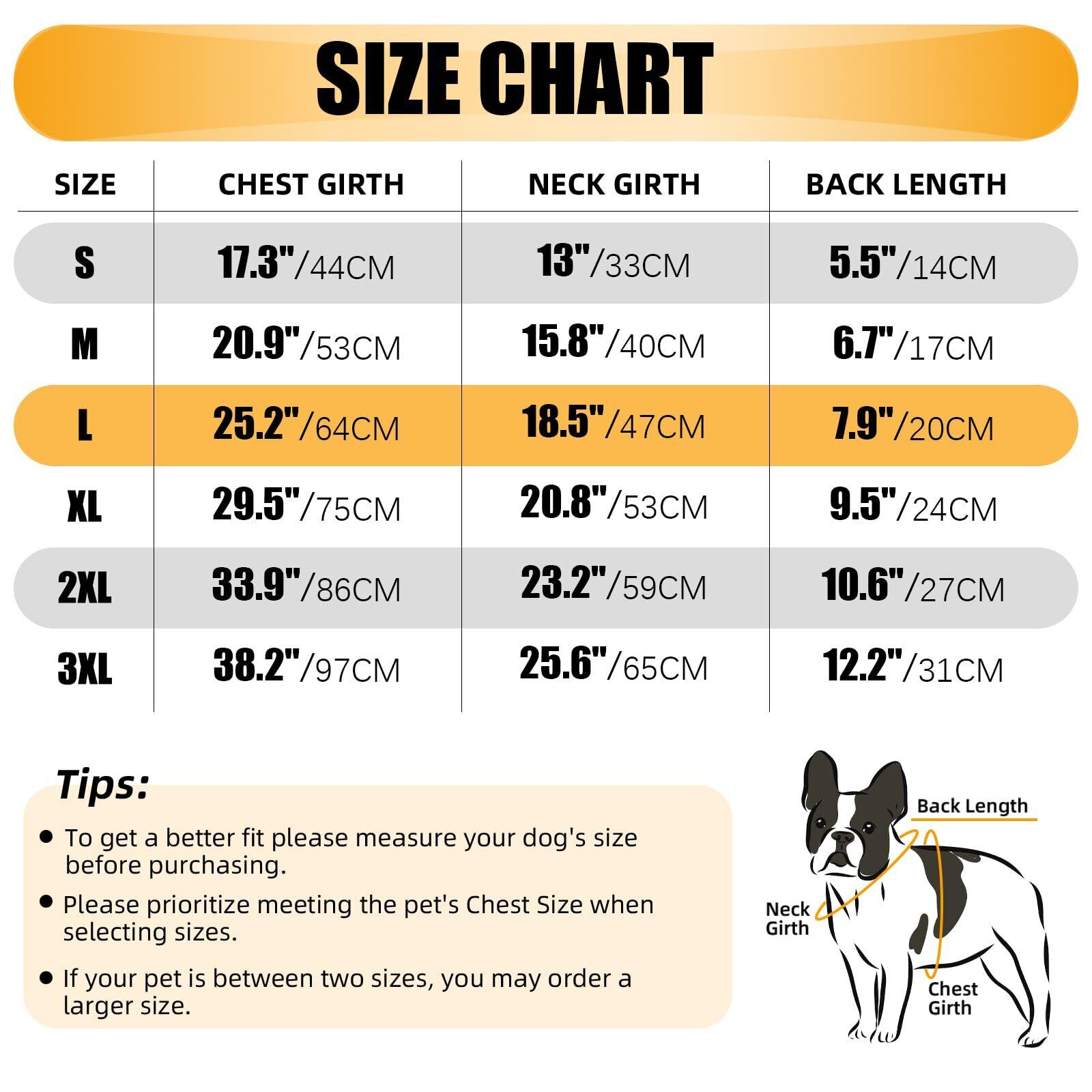多サイズ選択:S - 3XL までの全サイズラインアップ。小型犬、中型犬、大型犬など、様々な体型の犬にフィットするサイズが揃っている。注文前に必ずペットのサイズを測定し、サイズチャートを参照してください