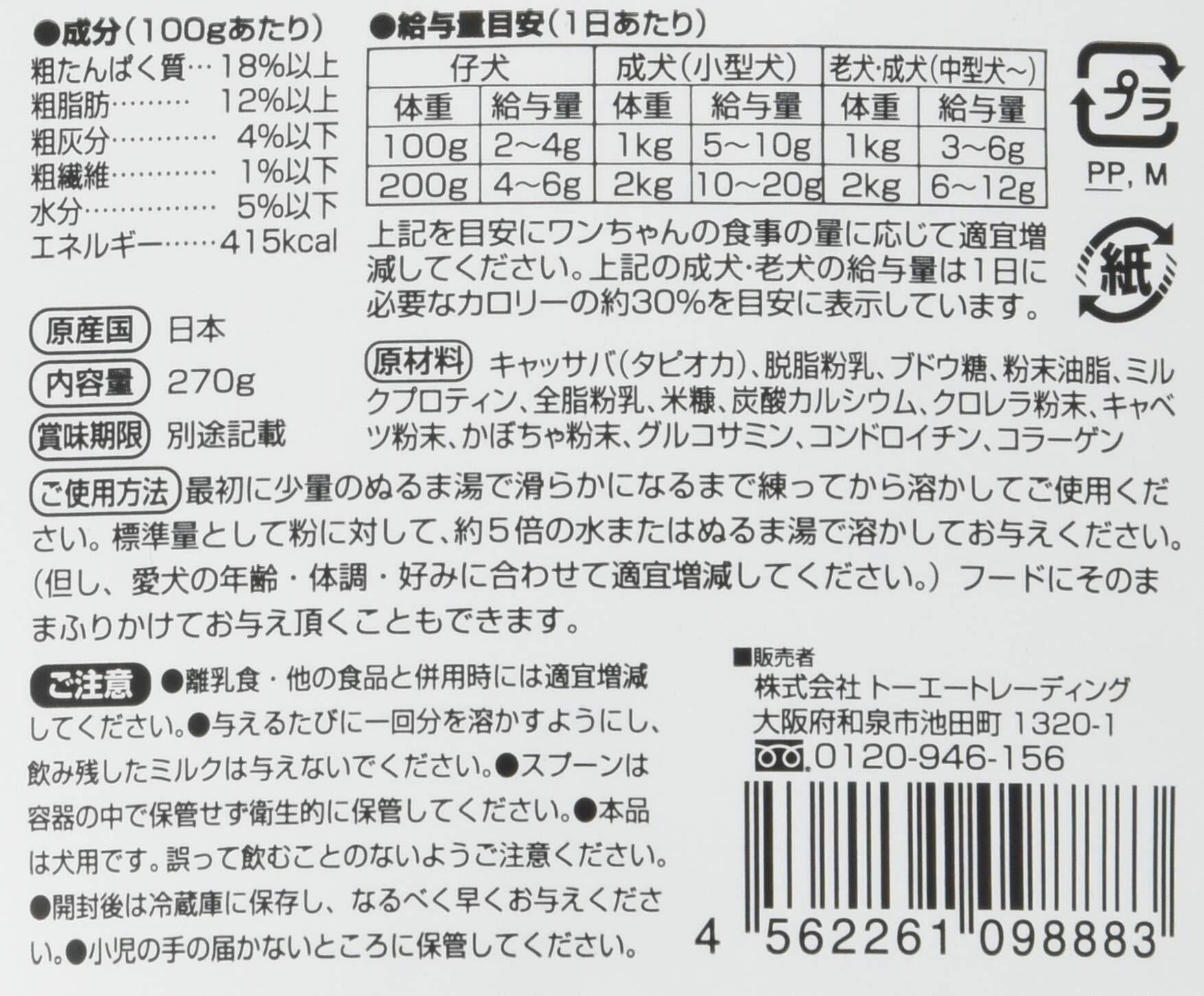 低脂肪タイプ(当社成犬用比)で、クロレラ・野菜パウダー・グルコサミン・コンドロイチン・コラーゲン配合。シニア犬の健康にやさしい成分配合した粉ミルクです。フードにそのままふりかけてお与え頂くこともできます。全犬種用(間食用)