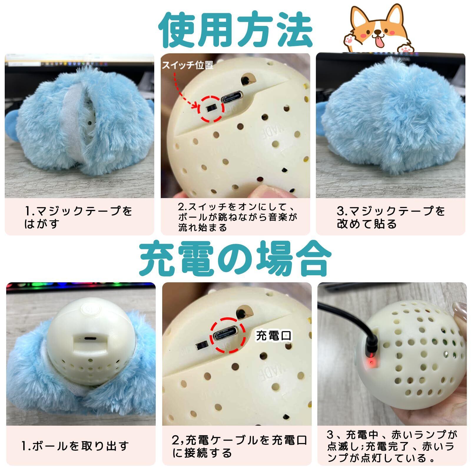 【使用が簡単】 1、電源ボタンを押して、ローリングボール犬用おもちゃを起動します。録音が完了すると、犬用おもちゃは録音を再生し、振動を開始します。 2.、優しく叩くと、おもちゃは音楽モードに入り、振動を始めます。曲が終わるのを待ってから再度叩くと、次の曲が再生されます。音楽は120曲が含まれています。 3、 使わないときは、電源を切り、ぬいぐるみカバーに戻して保管してください。