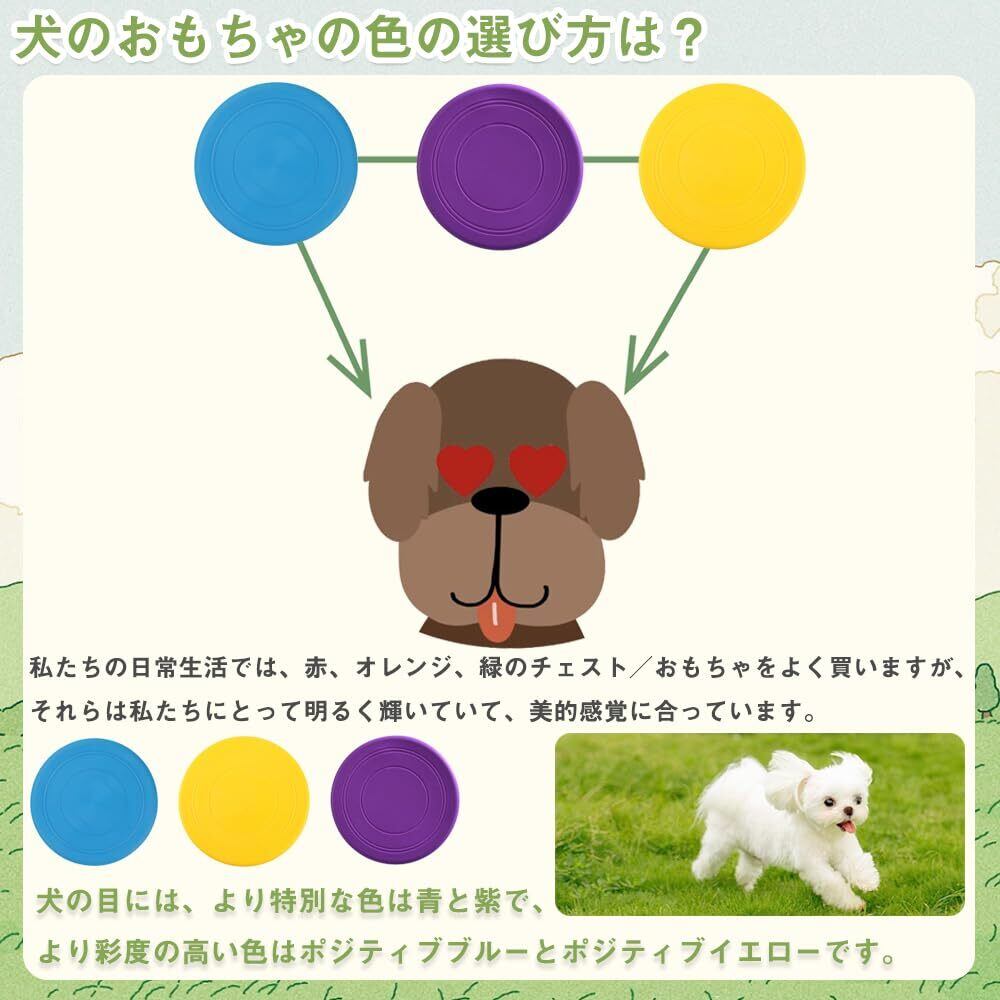 セット内容:ペットフリスビー3個セット カラー:パープル+ブルー+イエロー各 1 個 約17.5*17.5cm 厚さ:約1cm 素材:ソフトラバー(犬のおもちゃの色の選び方は?犬の目には、より特別な色は青と紫で、より彩度の高い色はポジティブブルーとポジティブイエローです。)