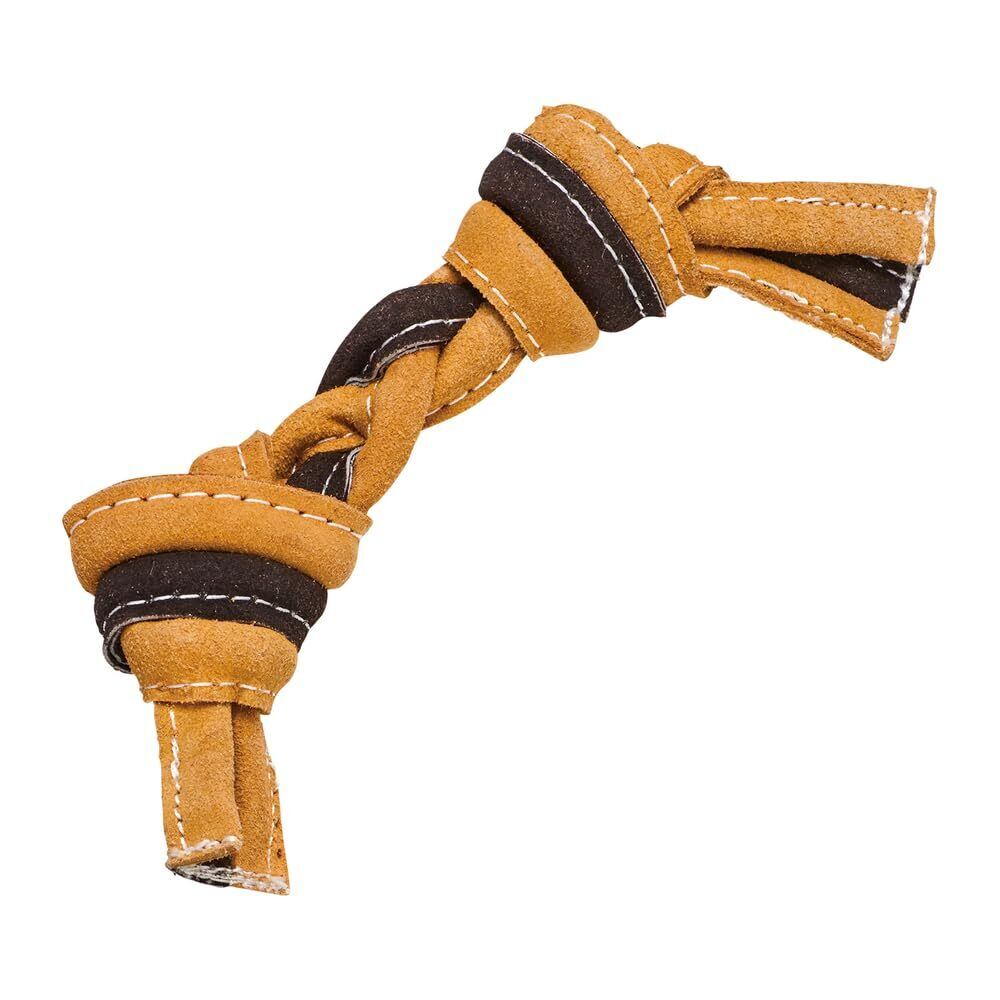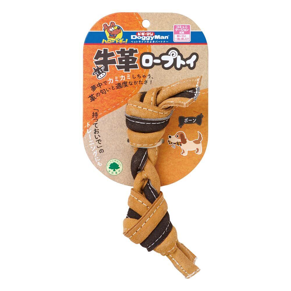 ・コットンの心材を牛革で包み込んで作ったロープを編んで結んで作った小型犬用おもちゃ。・牛革特有の香りと歯ごたえは獲物そのもの。天然素材による独特の弾力と噛み心地が犬の本能を刺激する。・牛革の香りに誘われてガシガシ噛んでも壊れにくい丈夫なおもちゃ。・噛みごたえがあるハードタイプ。ガシガシかじってデンタルケア玩具としても使える。・くわえて振り回したり、ガシガシかじるのに最適な「ボーン」型。長さ約24cm、幅約6cm。