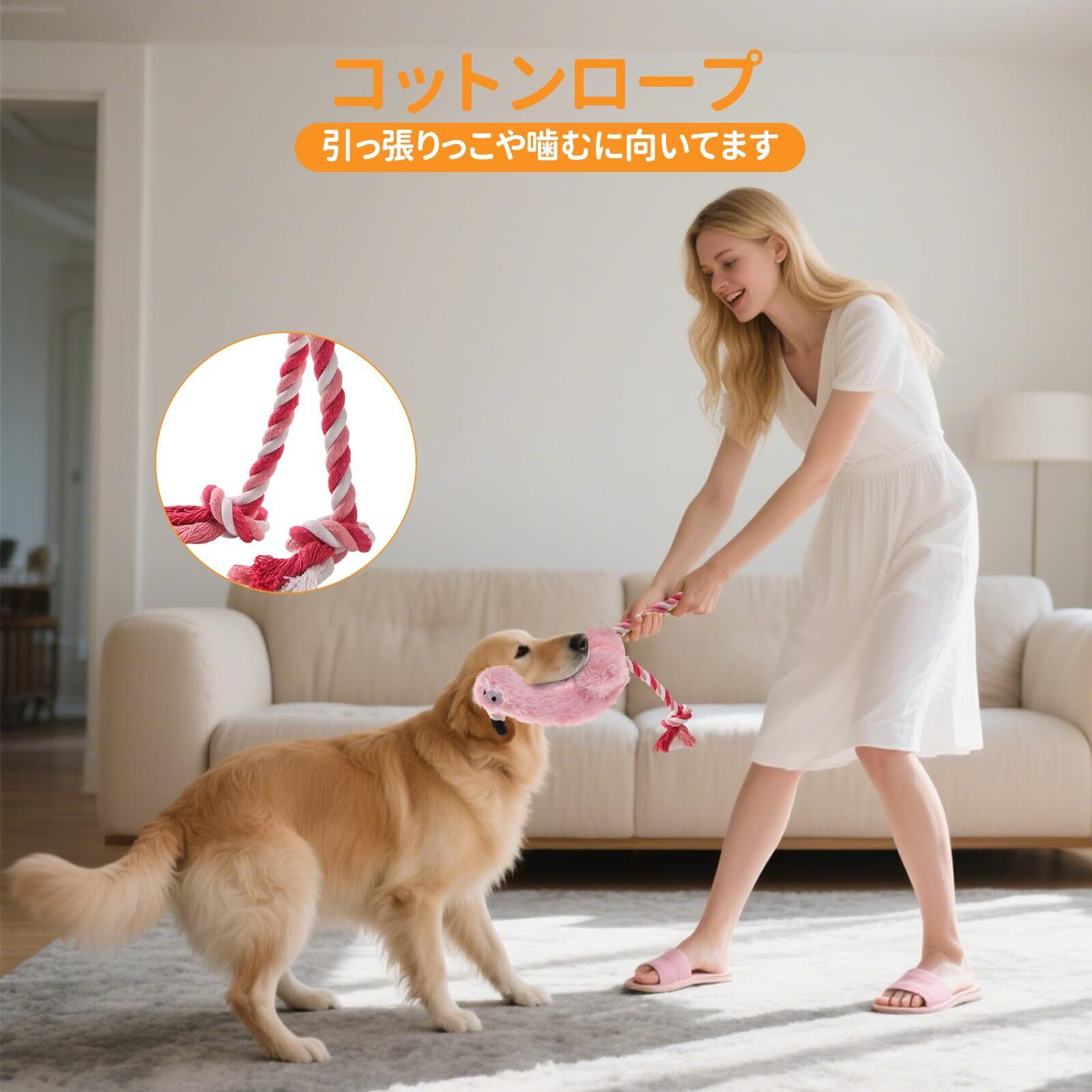 【頑丈な素材】玩具は高品質のプラッシュと天然コットンで作られており、安全で頑丈です。しっかりと編み込まれているので、ワンちゃんと引っ張り合いっこをして、仲を深めることもできます。