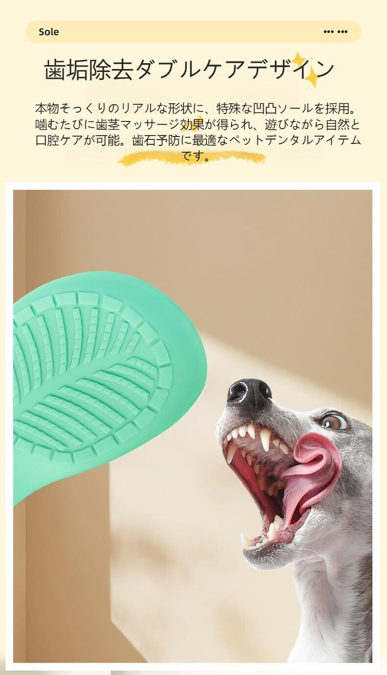 【歯垢除去ダブルケアデザイン】 本物そっくりのリアルな形状に、特殊な凹凸ソールを採用。噛むたびに歯茎マッサージ効果が得られ、遊びながら自然と口腔ケアが可能。歯石予防に最適なペットデンタルアイテムです。