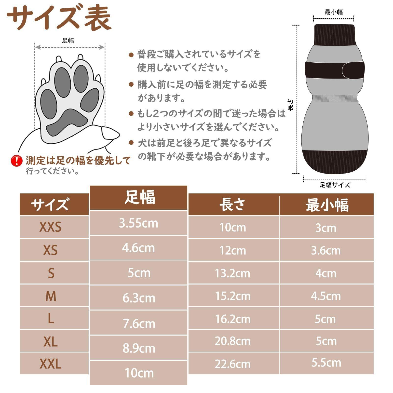 【サイズ】購入前にペットの足を測定し、サイズ表をご確認ください。もし犬の足幅が2つのサイズの間で迷っている場合は、少し小さいサイズを選ぶことをお勧めします。サイズはXSからXLまでの5種類があり、小型犬から大型犬まで対応しています。