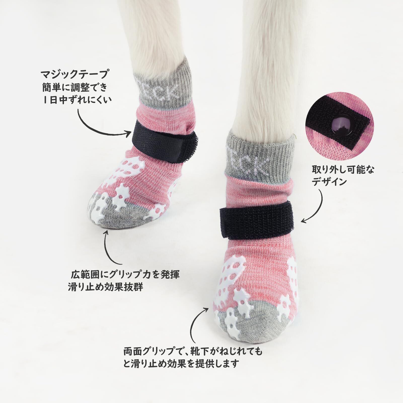 【犬用靴下の機能】犬用靴下は、犬の足元に優れたトラクションを提供し、鋭い爪から家具(フローリング、木製テーブル、ソファなど)を守ります。また、暑い舗装や冬の寒さから犬の足を保護し、痛みや擦り傷を防ぎます。さらに、爪の裂けや傷を防ぎ、舐めるのを防止する効果もあります。これらの靴下はシニア犬にも最適です。