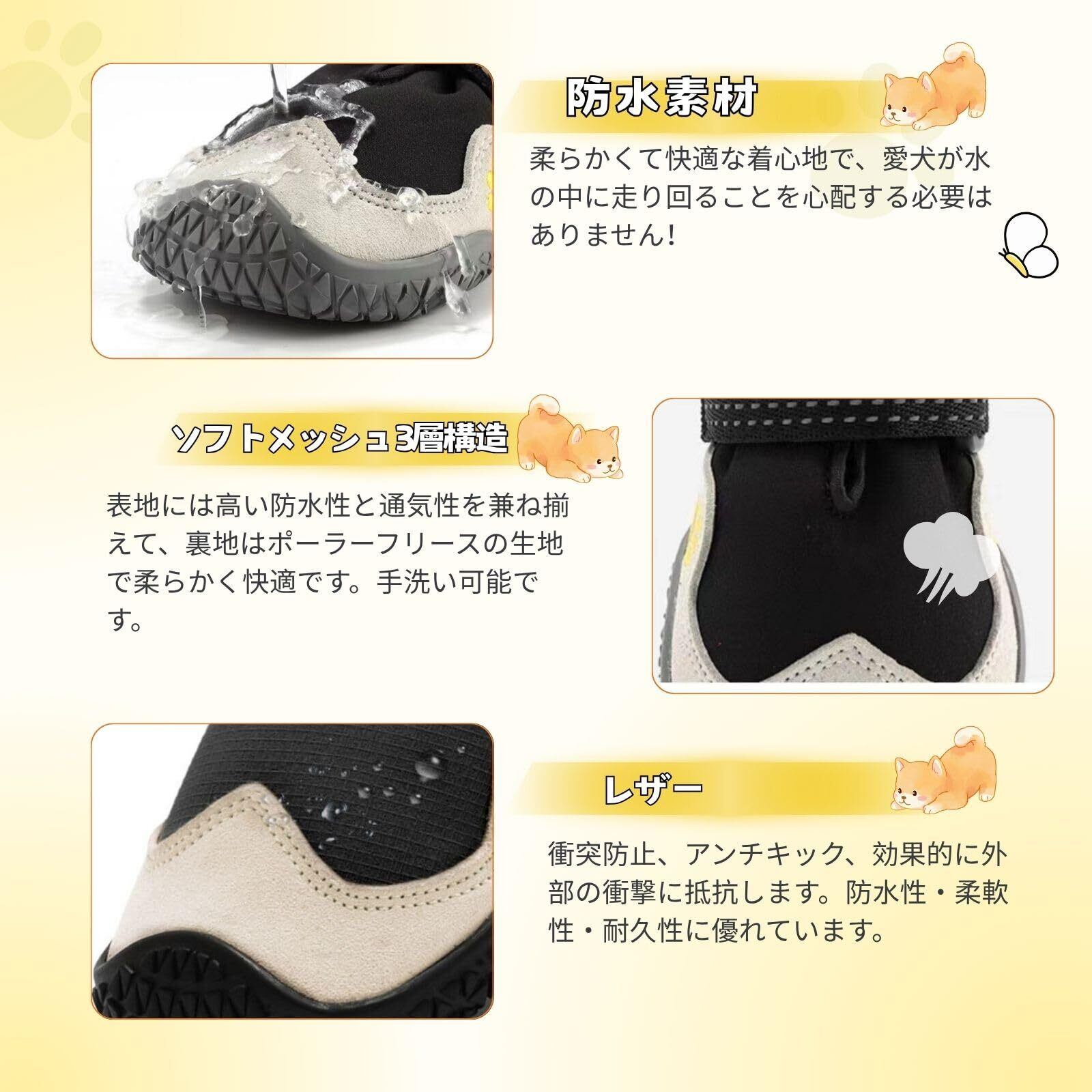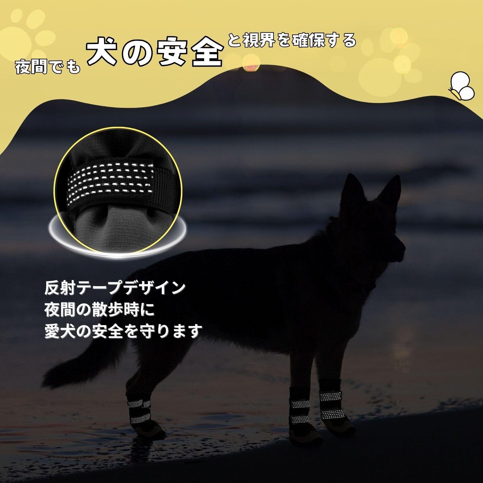【ダブルナイロンウェテープ・ハイライト反射】 ナイロンウェテープは柔らかく快適です。ナイロンベルトのハイライト反射で、夜間でも犬の安全と視界を確保する。高品質なベルクロを簡単に調整できる。履き口は日焼け止めと防塵を兼ねています。着せやすく、散歩中や動きまわったときに簡単に脱げない。