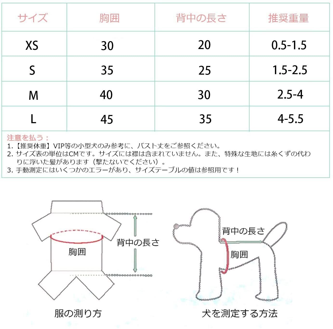 【サイズ情報】S:長さ25cm:バスト35cm、推奨重量1.5-2.5kg、 M:長さ30cm:バスト40cm、推奨重量2.5-4kg、L:長さ35cm:バスト45cm、推奨重量4-5.5kg。購入前に測定してくださいサイズ犬。