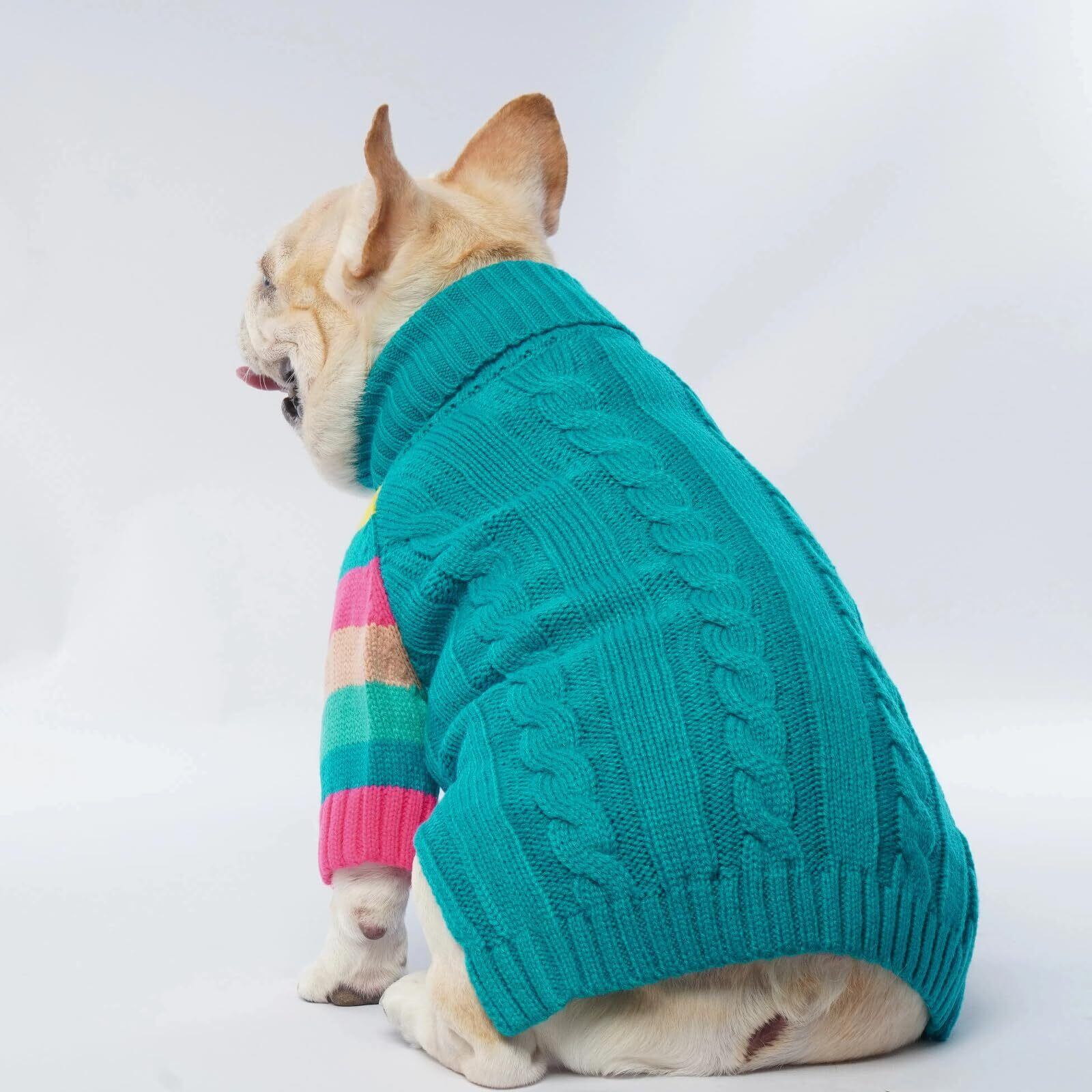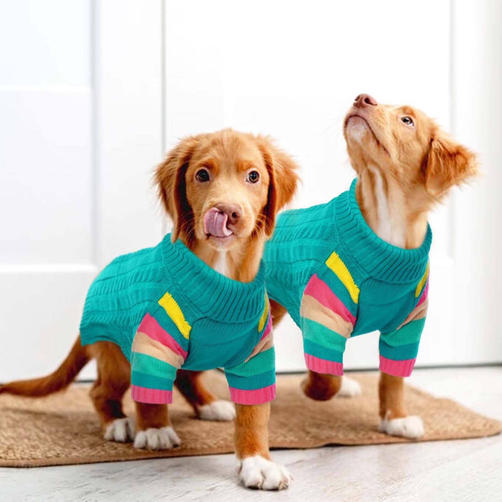 スタイリッシュな犬 服 冬:ニットの模様がいい風合いを醸し出し、犬 クリスマス 服全体の魅力を高めています。また、脚のカラフルなストライプ柄が遊び心とスタイリッシュな要素をプラスし、どんなパーティーでも愛犬を際立たせます。グリーンとピンクの犬 服 冬は、普段着にも、パーティーや写真撮影にも最適です。このクラシックカラーの犬 冬服を今すぐ購入して、冬の驚きをもっと楽しみましょう