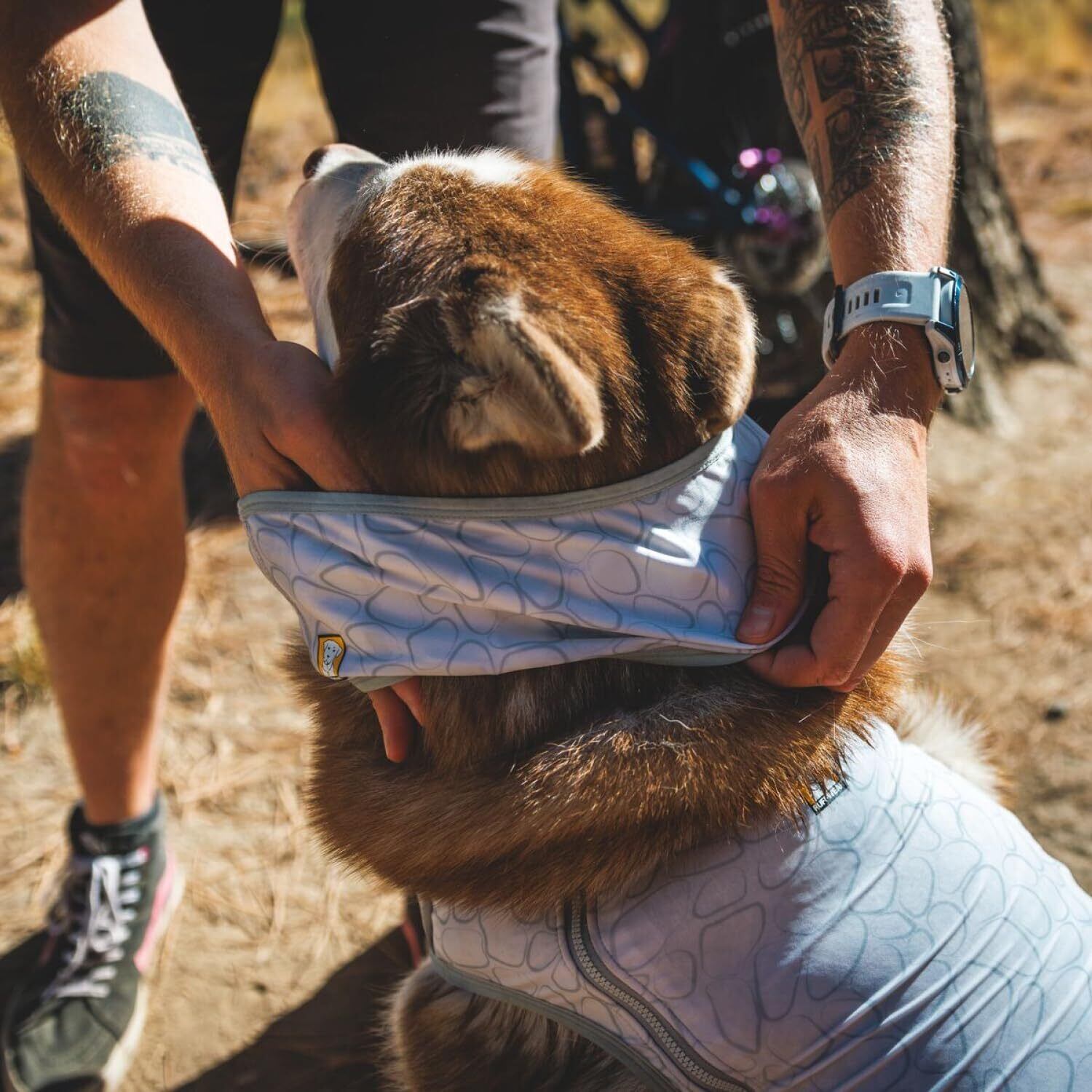 ラフウェアのスワンプクーラーネックゲーター(SS25)は、スワンプクーラーテクノロジーを採用した、気化熱(蒸発冷却効果)を利用して愛犬を冷やす、暑い夏におすすめのクーリングアイテムです。UPF50+で、軽量なストレッチスパンデックス生地のこのアイテムは、頭を通して首に装着します。単独でも、スワンプシリーズと組み合わせても使用できます。着用前に水に浸すか、水筒や蛇口から水をかけて、蒸発冷却に必要な水分を中間層に吸収し蓄えます。使用中乾いてきた時には、着用したまま水をかけて水分をリチャージすることもできます。リバーシブルデザインなので、柄と無地の両方を楽しめます。