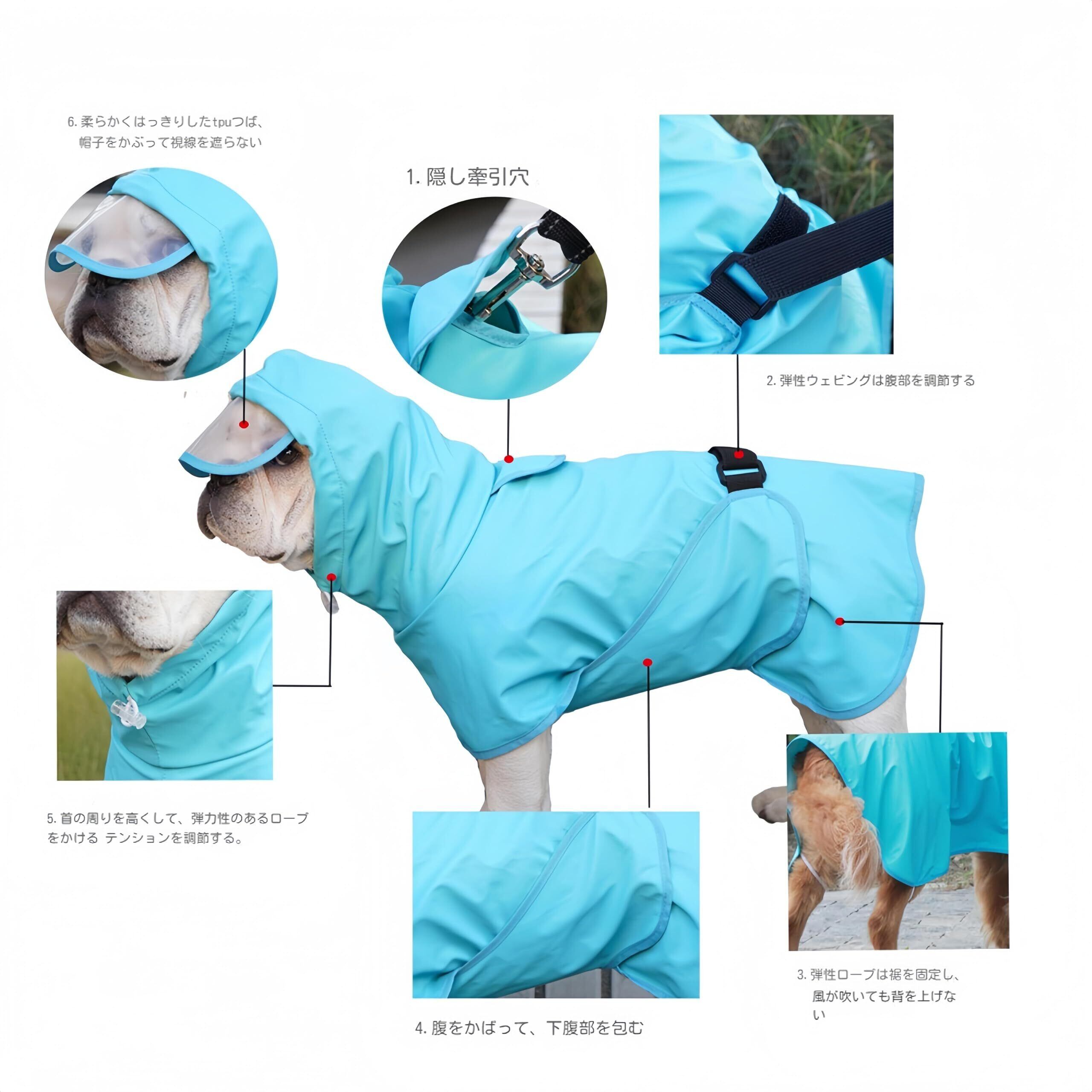 【優れた防水・防風・通気性能】表面に撥水加工が施され、3重塗装のPU生地により、防雨・防風性能が抜群です。縫い目にもホットプレス防水加工が施されており、雨の侵入をしっかり防ぎます。さらに、雪の日にも効果的です。フードには大面積の透明PVCを使用しており、犬の視界を妨げず、長いツバが顔全体をカバーします。