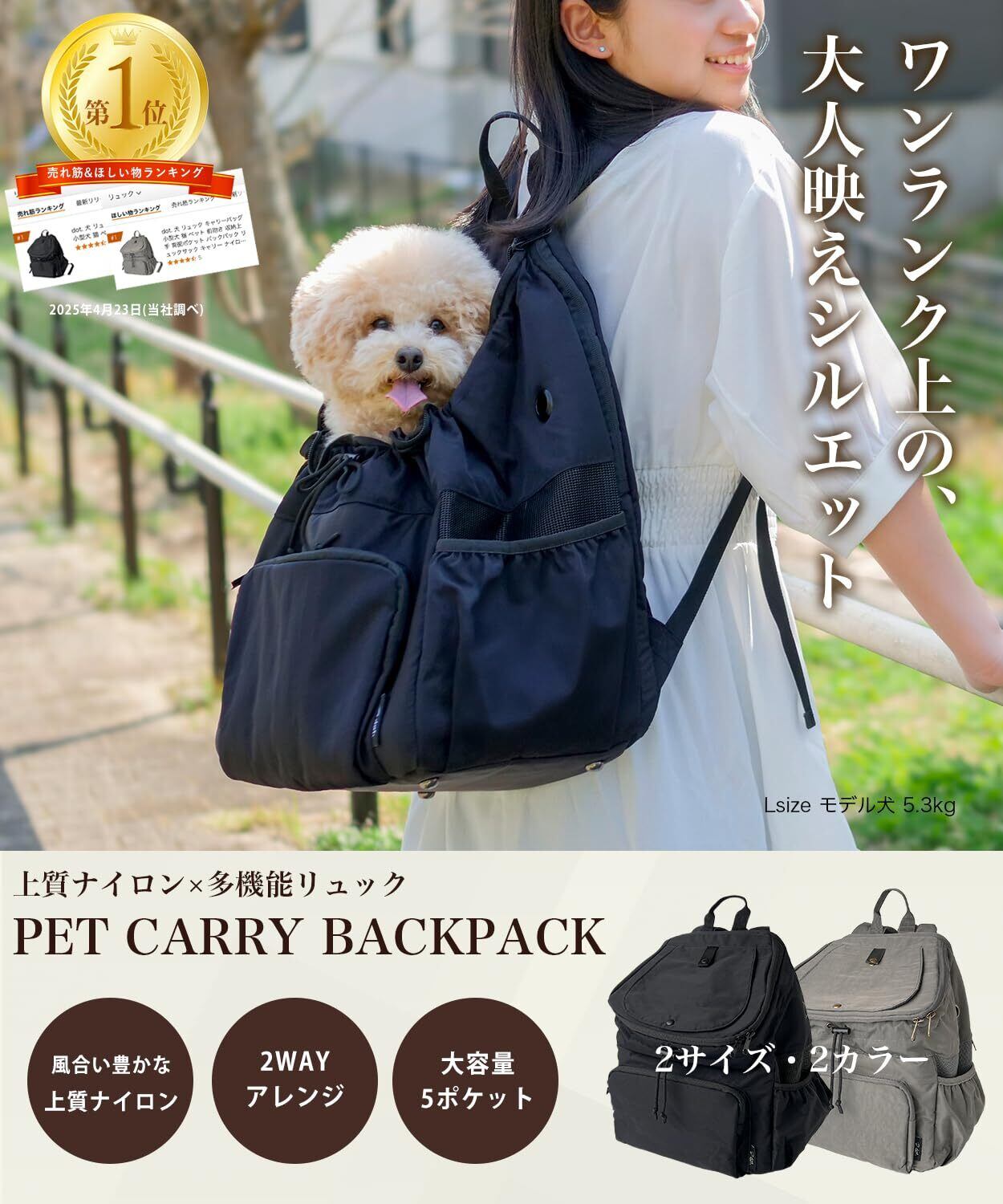 【選べる2サイズ】M・Lの2サイズ展開で、体型に合わせたぴったりサイズが選べます。<Mサイズ>(超小型犬・小型犬・子猫・パピー向け)幅30cm × 奥行18cm × 高さ37cm / 重量 約800g / 目安体重 2~4kg<Lサイズ>(小型犬・成猫向け)幅36cm × 奥行22cm × 高さ44cm / 重量 約940g / 目安体重 4~7kg ※目安体重以内でも犬種や体型によりフィット感が異なります。ご購入前に必ず体長(首の付け根〜しっぽの付け根)とお座り時の高さを測定し、余裕のあるサイズをお選びください。