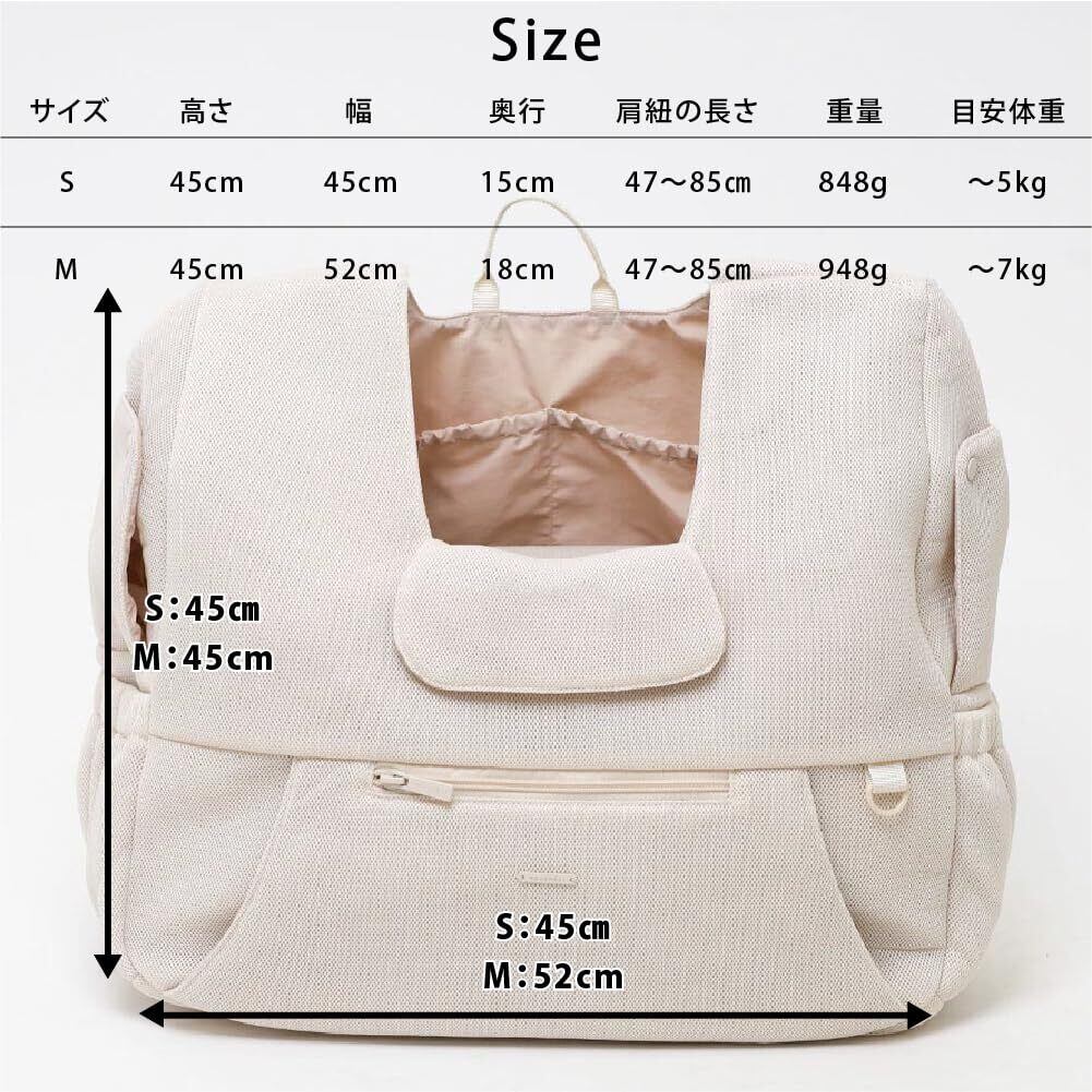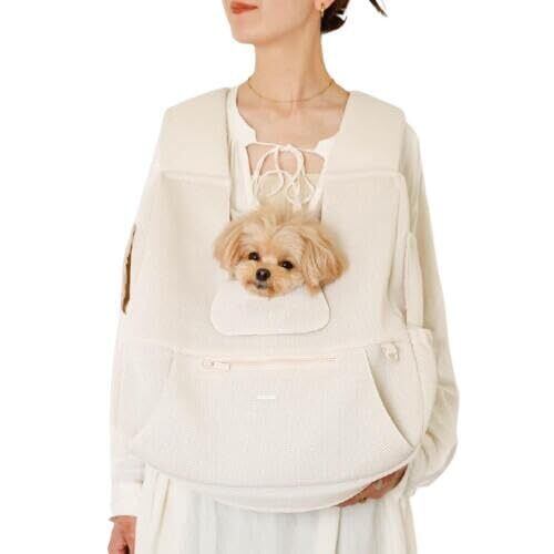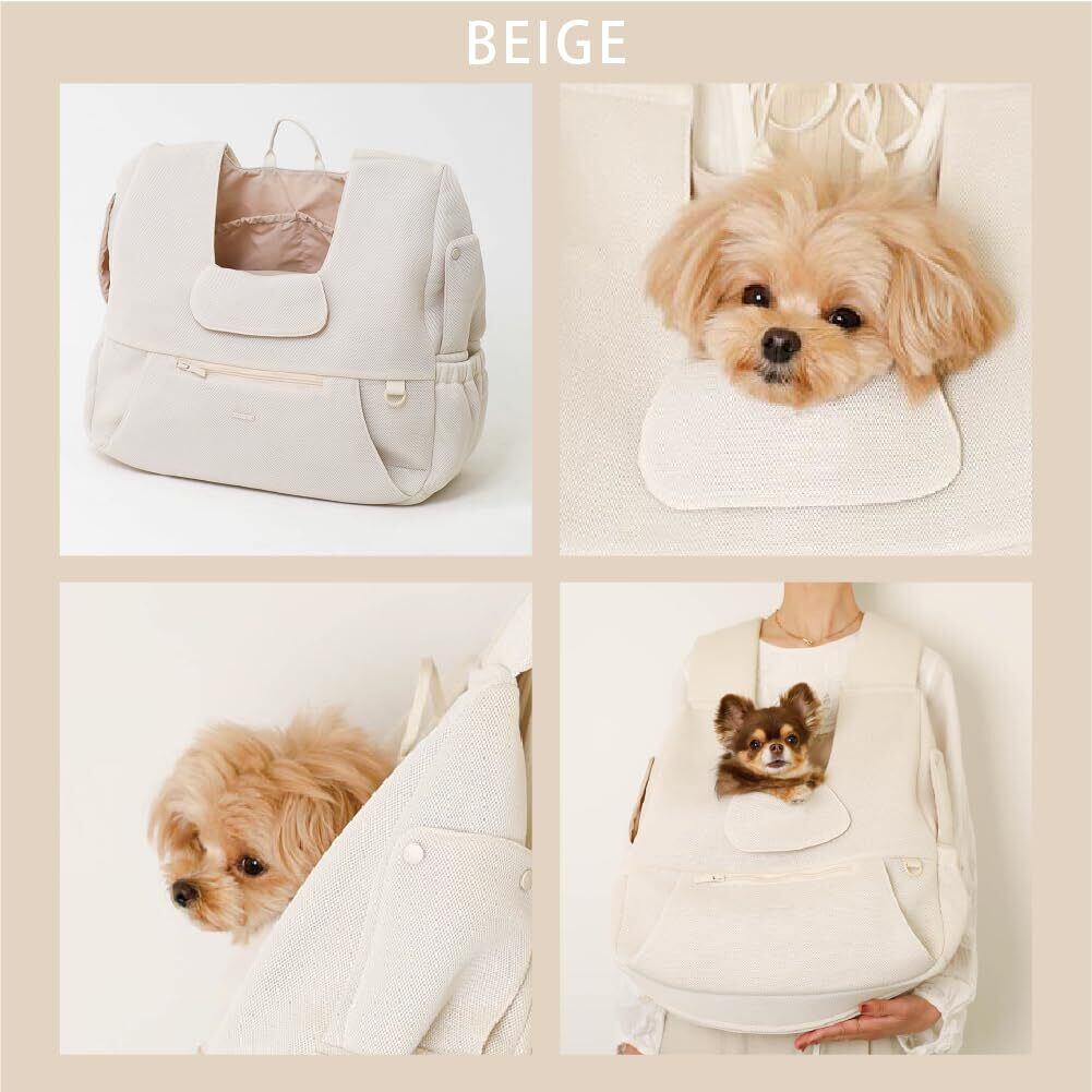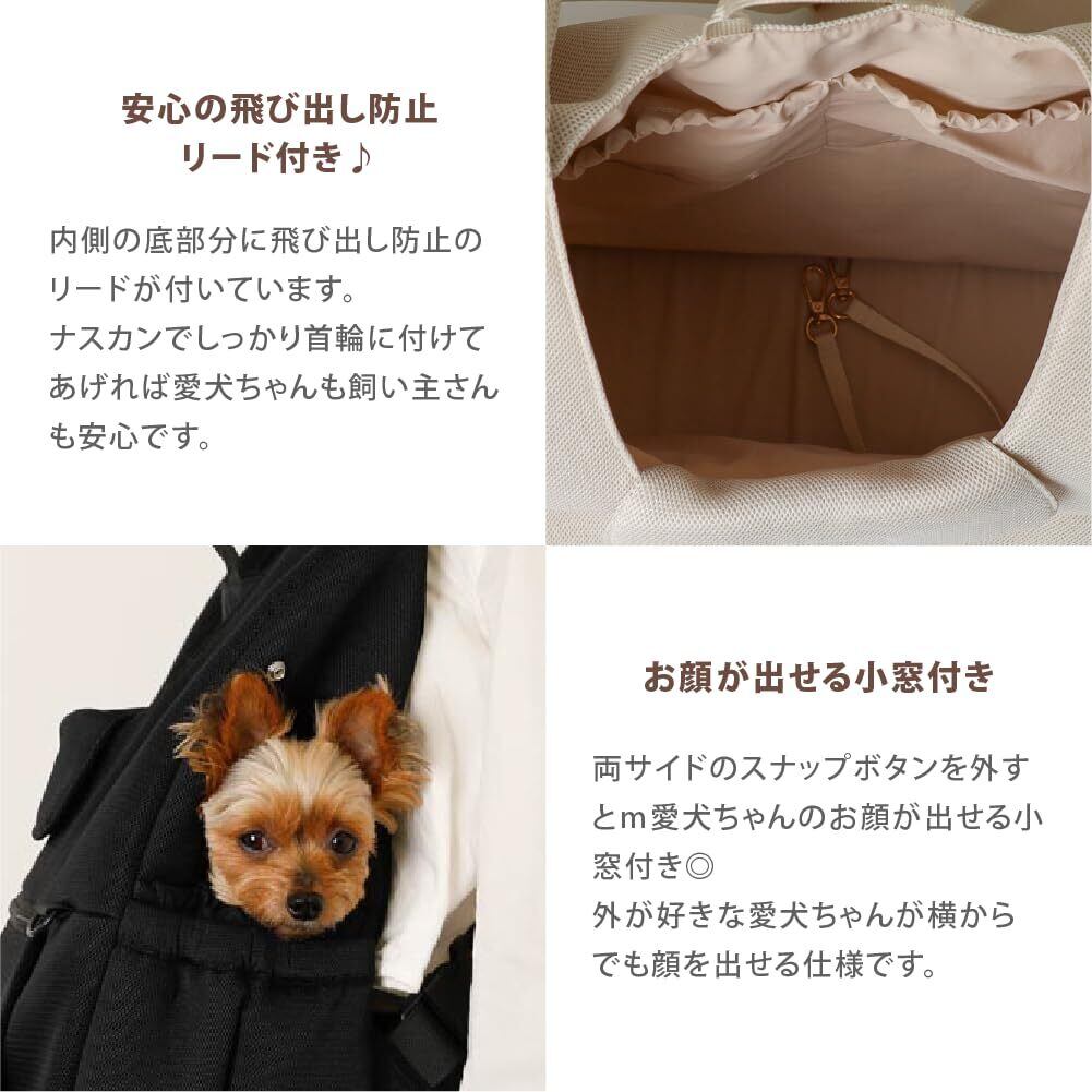 【愛犬ちゃんも飼い主さまも安心】内側には飛び出し防止リード付き。両サイドのスナップボタンを外すと、愛犬ちゃんのお顔が出せる小窓付き◎飼い主さまもこちらの小窓から手を入れて、愛犬ちゃんを撫でながらお互いリラックスできます。 バッグ口にはメッシュ素材のマナーカバー付きで、公共の場所をご移動する際は絞り紐で絞って安全にご移動が出来ます。