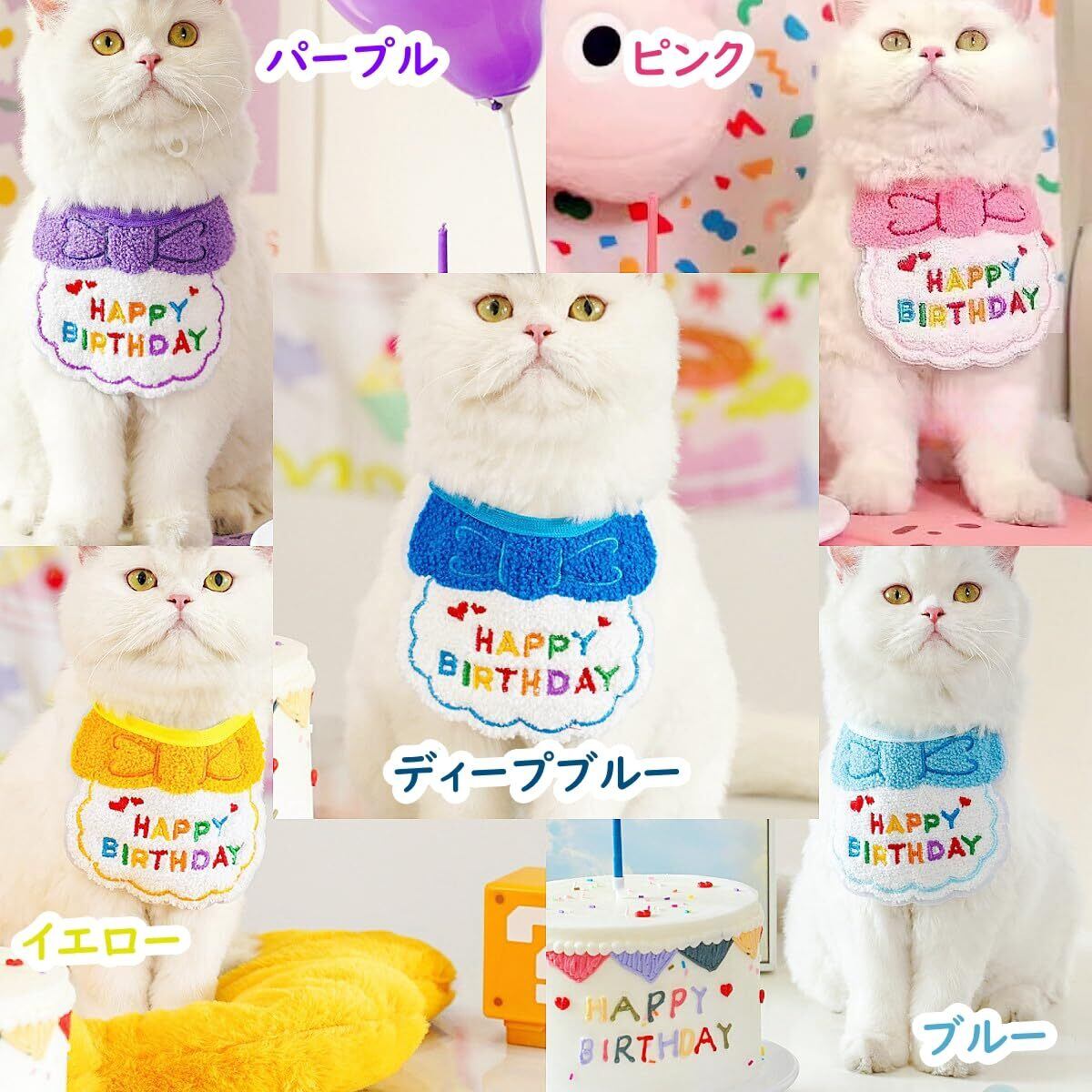 【色が豊富】:愛犬や愛猫のお誕生日会にぴったりなアイテム。ピンク、イエロー、ブルー、パープル、ディープブルーの5色を用意しており、ペットの性別や洋服に合わせて選べます。