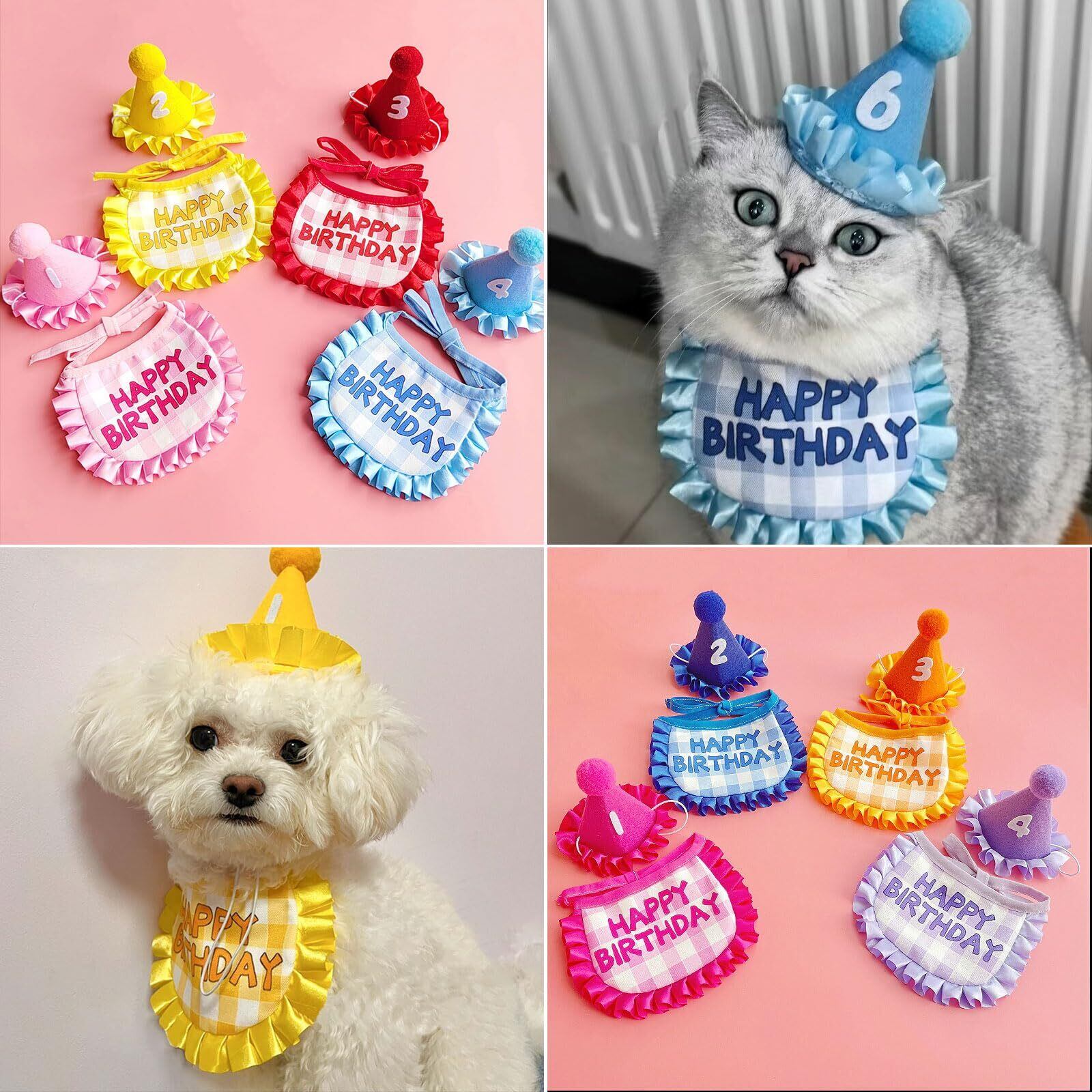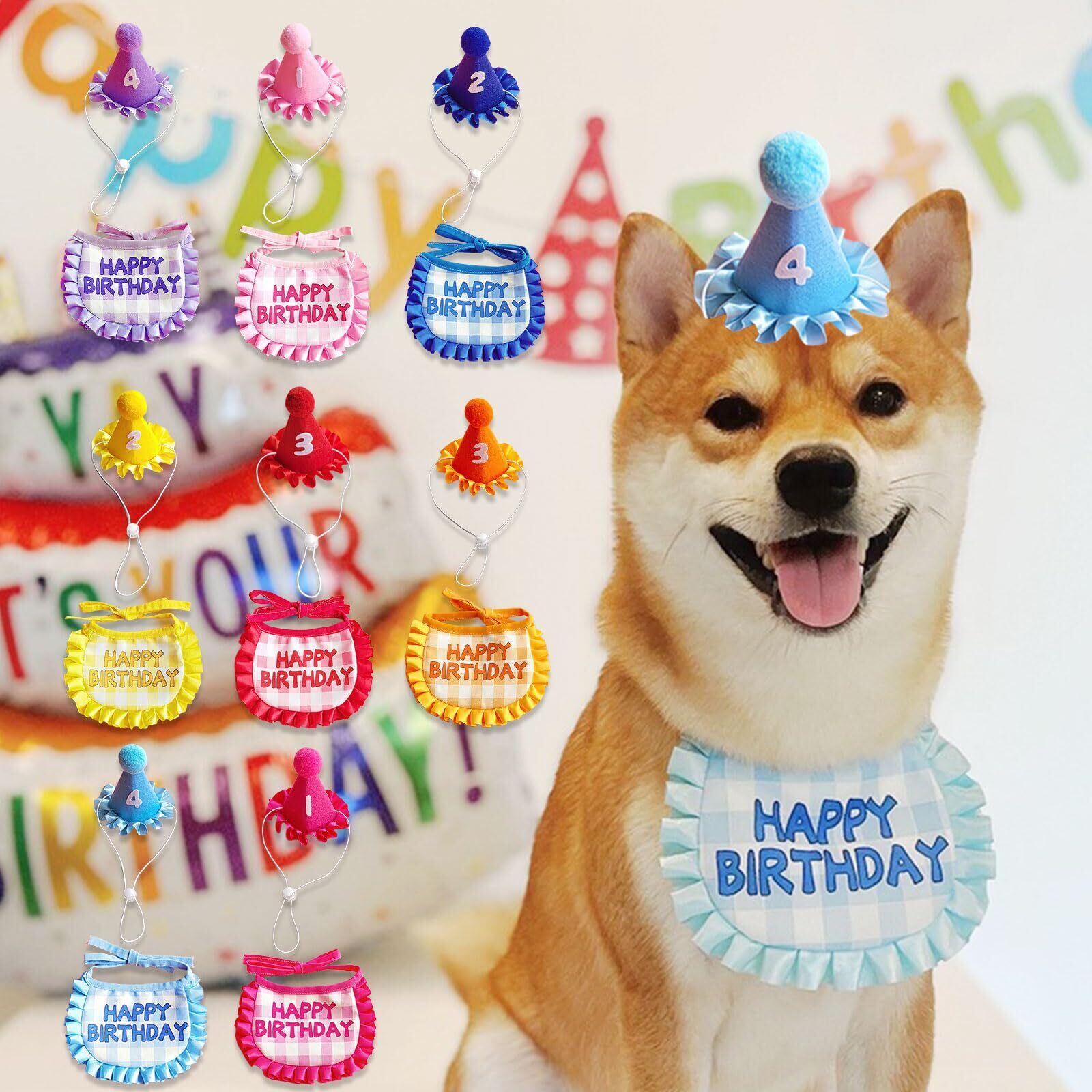 【犬誕生日グッズ】『happy birthday』バンダナ、ポンポン付き帽子やキ0-9数字を組み合わせるペット誕生日グッズです。愛犬のお誕生日会にピッタリのアイテムです。