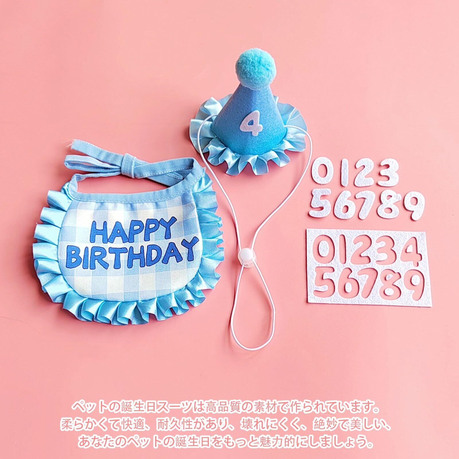 犬 誕生日グッズ 3点セット おしゃれ 犬 誕生日 帽子 Happy Birthday バンダナ よだれかけ 数字付き 犬 猫用 誕生日 帽子 スタイ 唾液タオル ペット 誕生日 飾り プレゼント (ブルー)