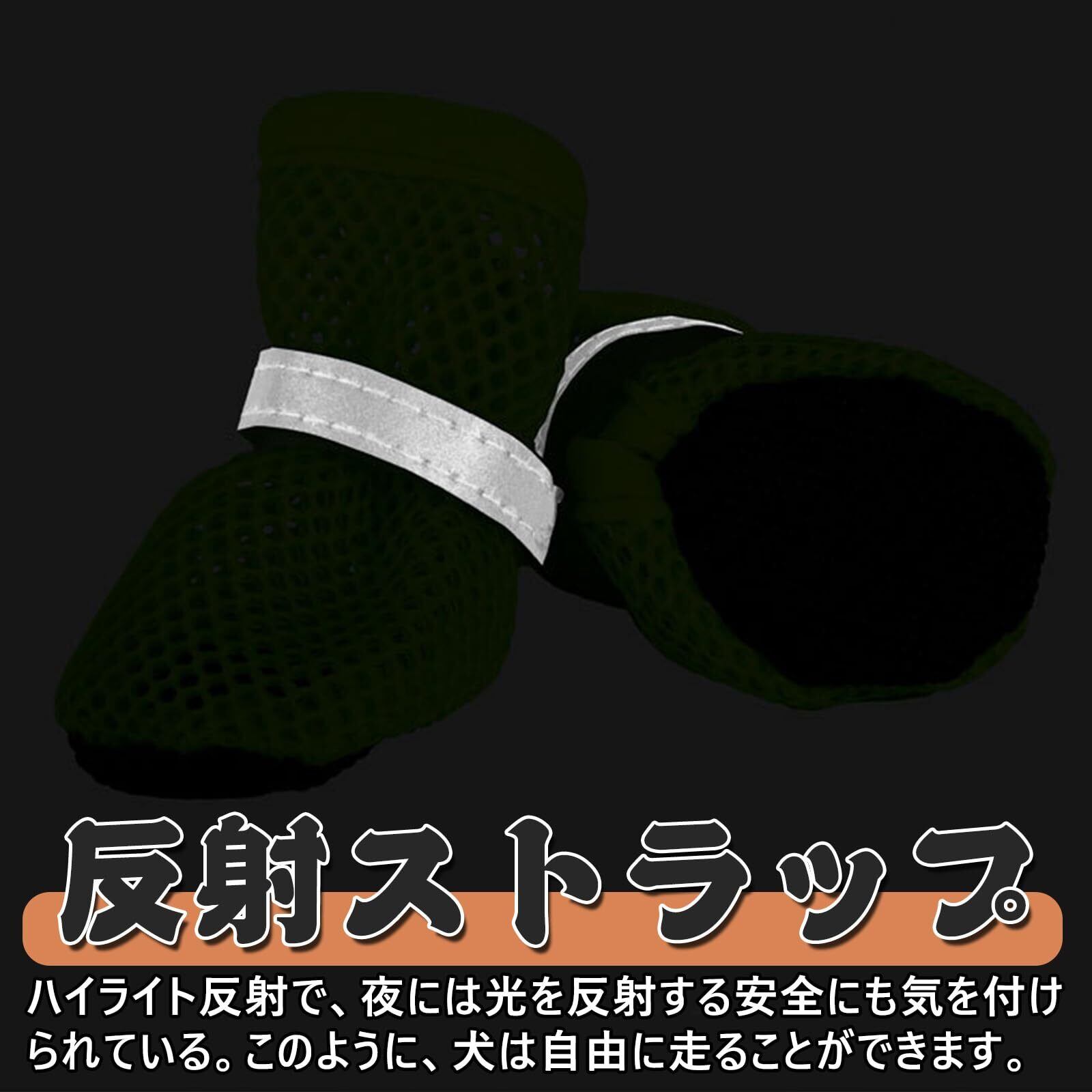 【ハイライト反射、安全性アップ】 ハイライト反射で、夜には光を反射する安全にも気を付けられている。メッシュで軽いことと、ぐにゃぐにゃ曲がる靴底が特徴で、ワンちゃんは何も履いていないかのように使う。