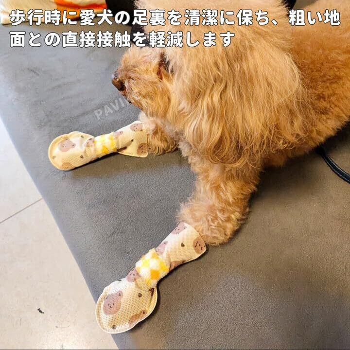 【美しさと実用性を兼ね備え】鞋面にはかわいいクマのプリントが施されており、見た目も魅力的で、犬が履くといっそう愛らしさを増します。同時に実用性も備えており、外出時に犬の足が汚れるのを防ぐのに役立ち、美しさと実用性を両立させています。この犬 靴 散歩用 使い捨てブーツは使い捨て設計で、20 個入りで約 5 回使用できるため、便利で手間が省け、ペットの主人が求める外観と機能の両方を満たすかもしれません。