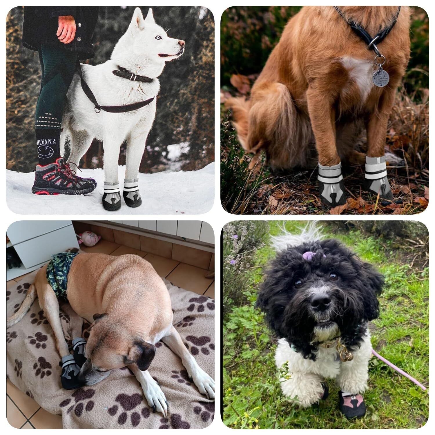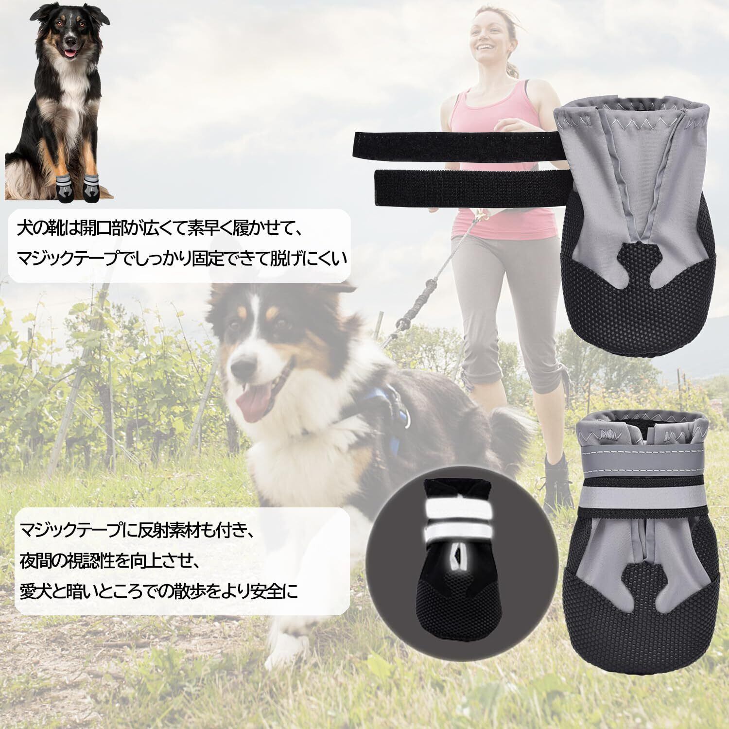 履かせやすい&脱げにくい:弊社の犬の靴は開口部が広くて素早く履かせて、マジックテープでしっかり固定できて脱げにくいです。マジックテープに反射素材も付き、夜間の視認性を向上させ、愛犬と暗いところでの散歩をより安全に