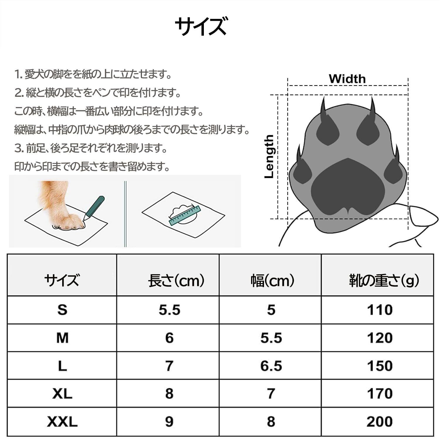 Sサイズ:5.5 × 5 cm、Mサイズ:6 × 5.5 cm、Lサイズ:7 × 6.5 cm、 XLサイズ:8 × 7 cm (ご注意:犬の種類によって前足と後足の大きさが少し違う子もいるので、ご購入前に必ず愛犬の前後の足を測定してください)