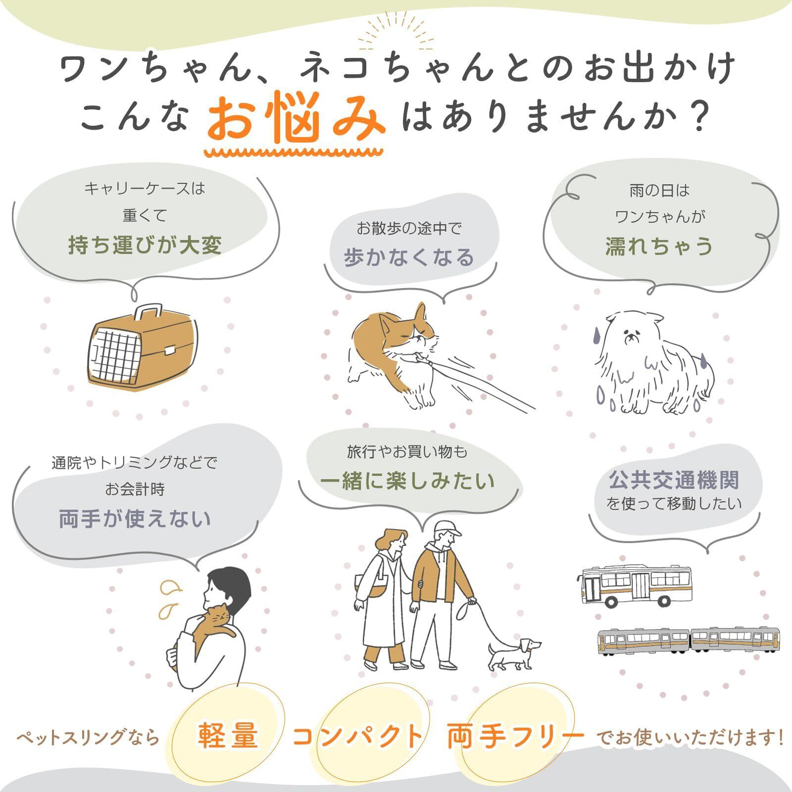 【様々なシーンで活躍】ペットスリングは両手がフリーになるので通院、トリミング、旅行、お買い物などのお出かけや万が一の災害時、お家での家事中など幅広くご活躍します。ペットとのお出かけがより快適で便利になるペットスリングです。