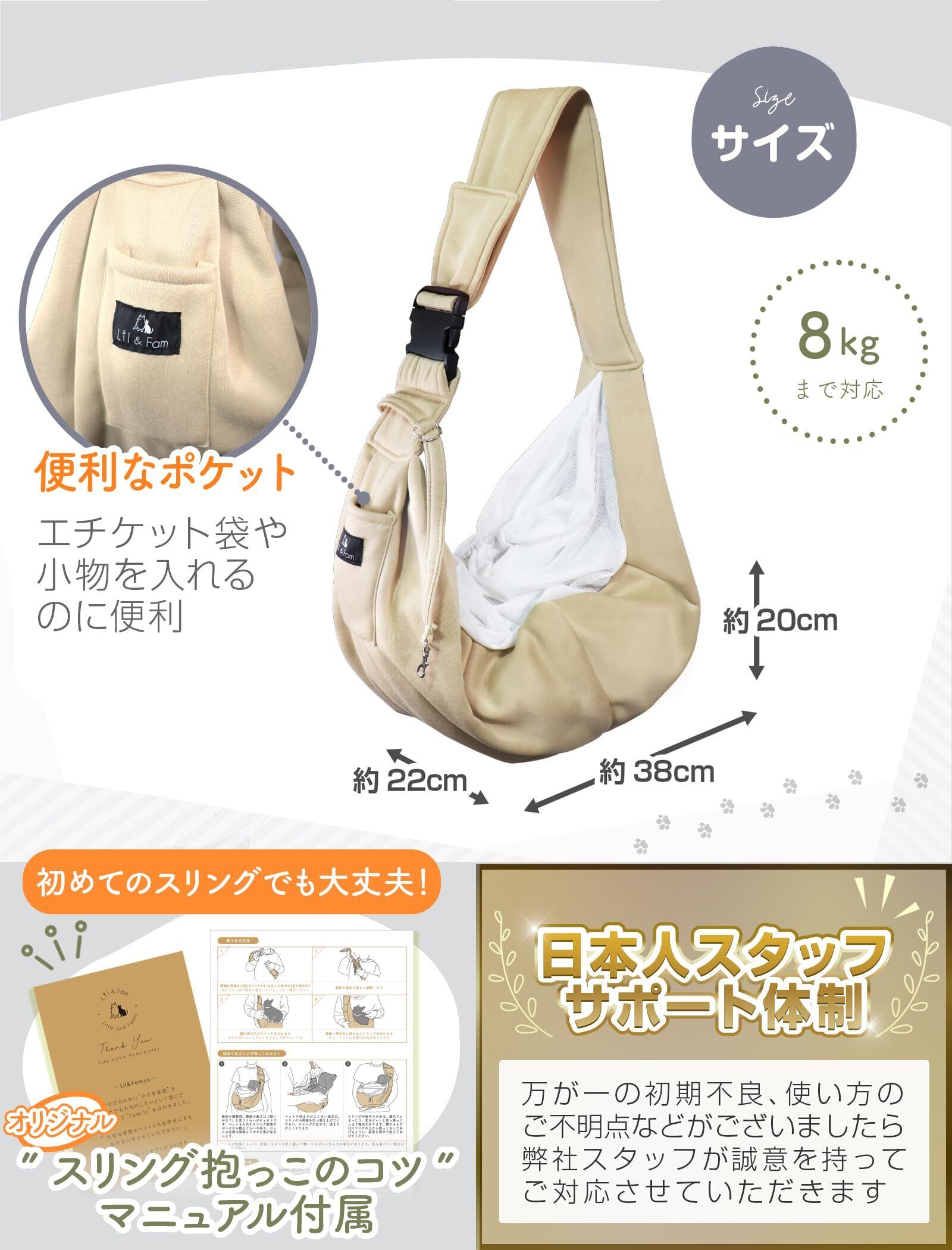 【気軽に使えるペットスリング】軽量&コンパクトだから持ち運びにとっても便利です。飼い主さんの体温が伝わるから甘えん坊のペットも安心!推奨体重8kg以内の犬(小型犬、中型犬)、猫、小動物(ウサギなど)に対応可能なペット用抱っこ紐です。