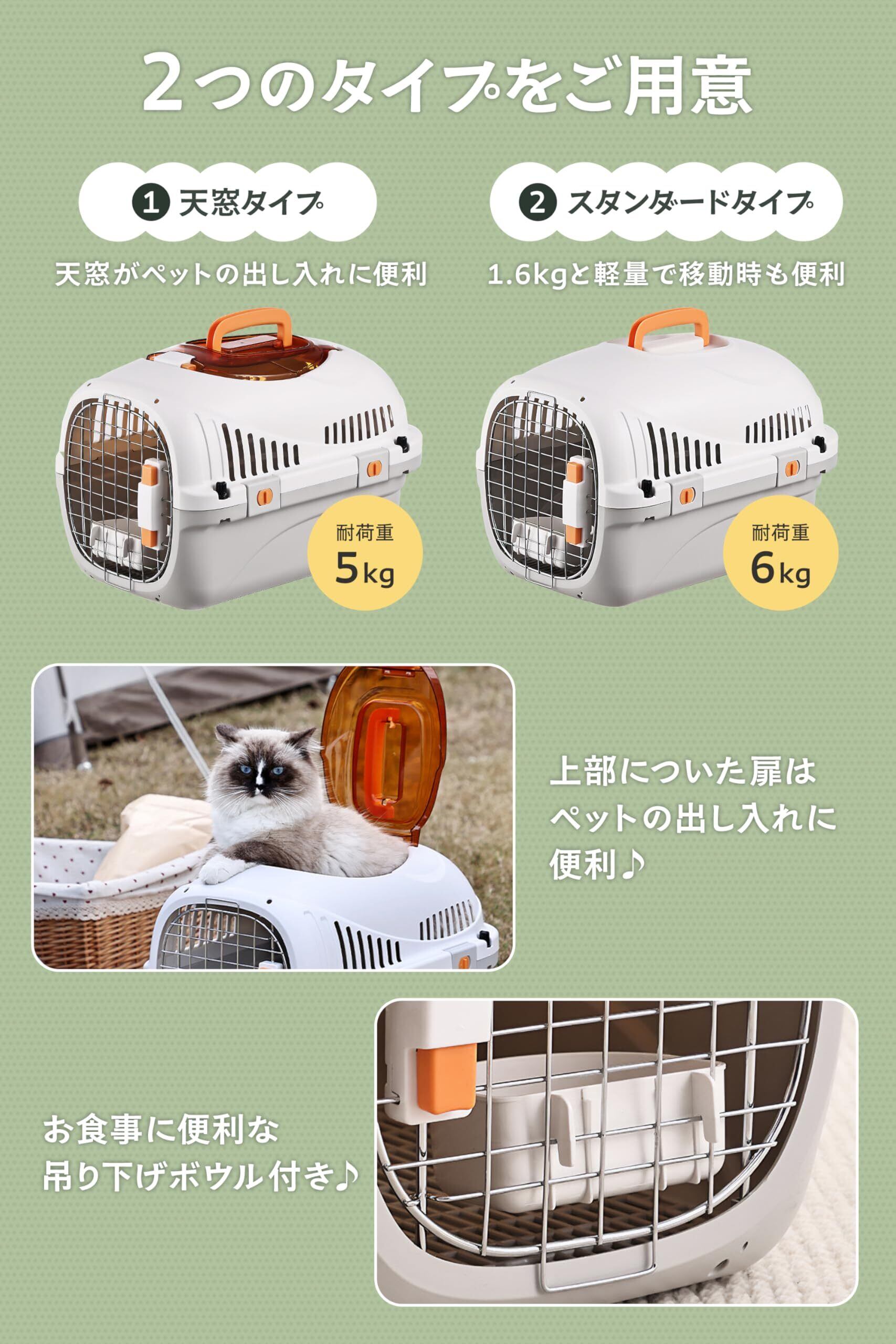 【様子が確認できる天窓付き】天窓付きのクレートなのでペットの様子確認に便利!開閉できる設計となっており、フタを開けておやつをあげたり、抱き抱えて入れてあげることも可能な犬、猫にオススメのハードタイプのキャリーです。(材質:PP+ABS+鉄、重量:1.7kg、推奨ペット体重:5kg以下)