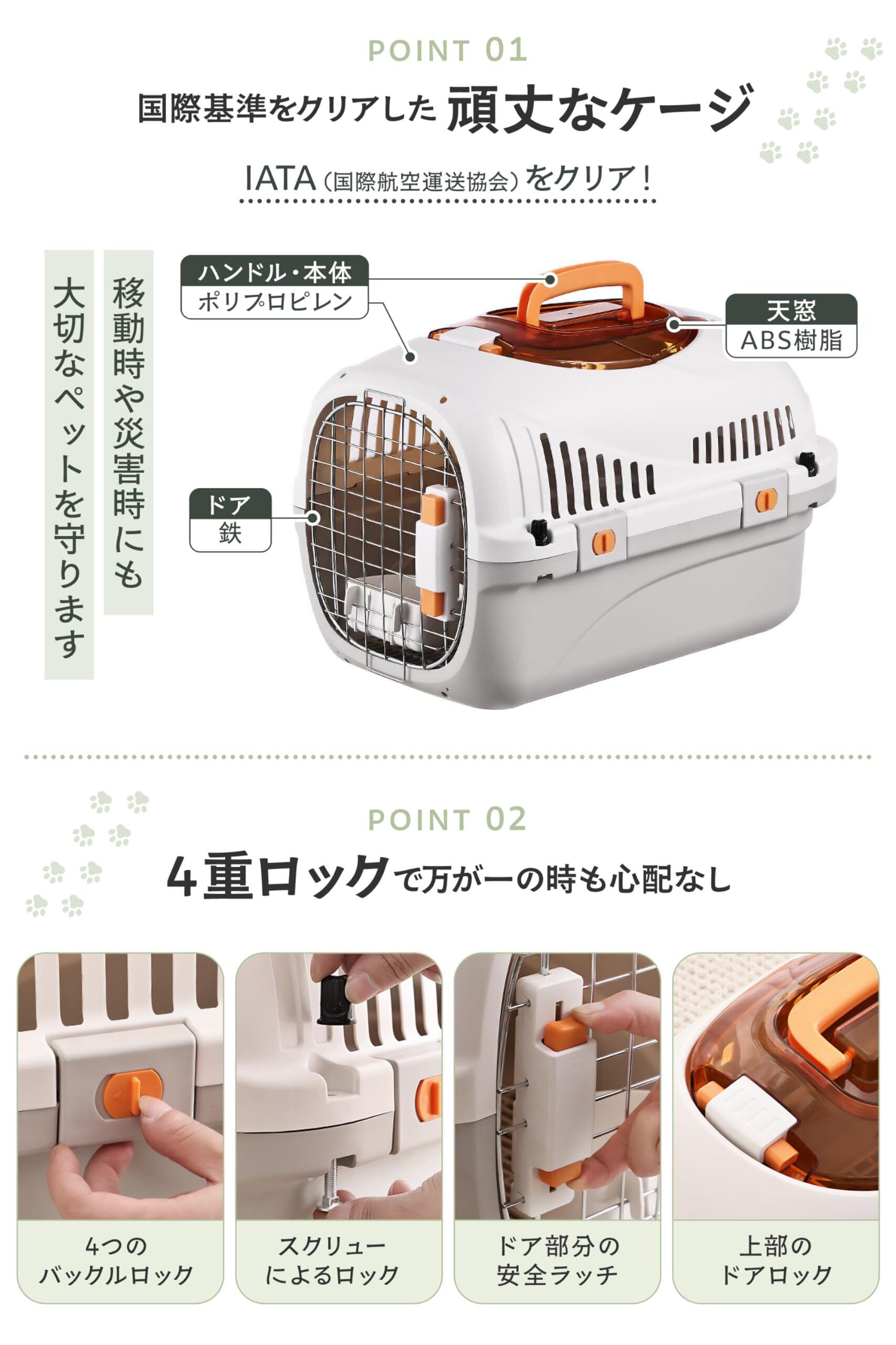 【頑丈な設計と耐久性】耐久性に優れたPP素材を主に使用し、長く使えるペットキャリー。動きが多いペットでも心配なく利用でき、しっかりとした作りが特徴の犬・猫にオススメのキャリーケースです。犬のキャリーバッグとしても利用でき、大切なペットをしっかりと守ります。こちらはIATA(国際航空運送協会)をクリアしたペットキャリー( クレート )となっています。