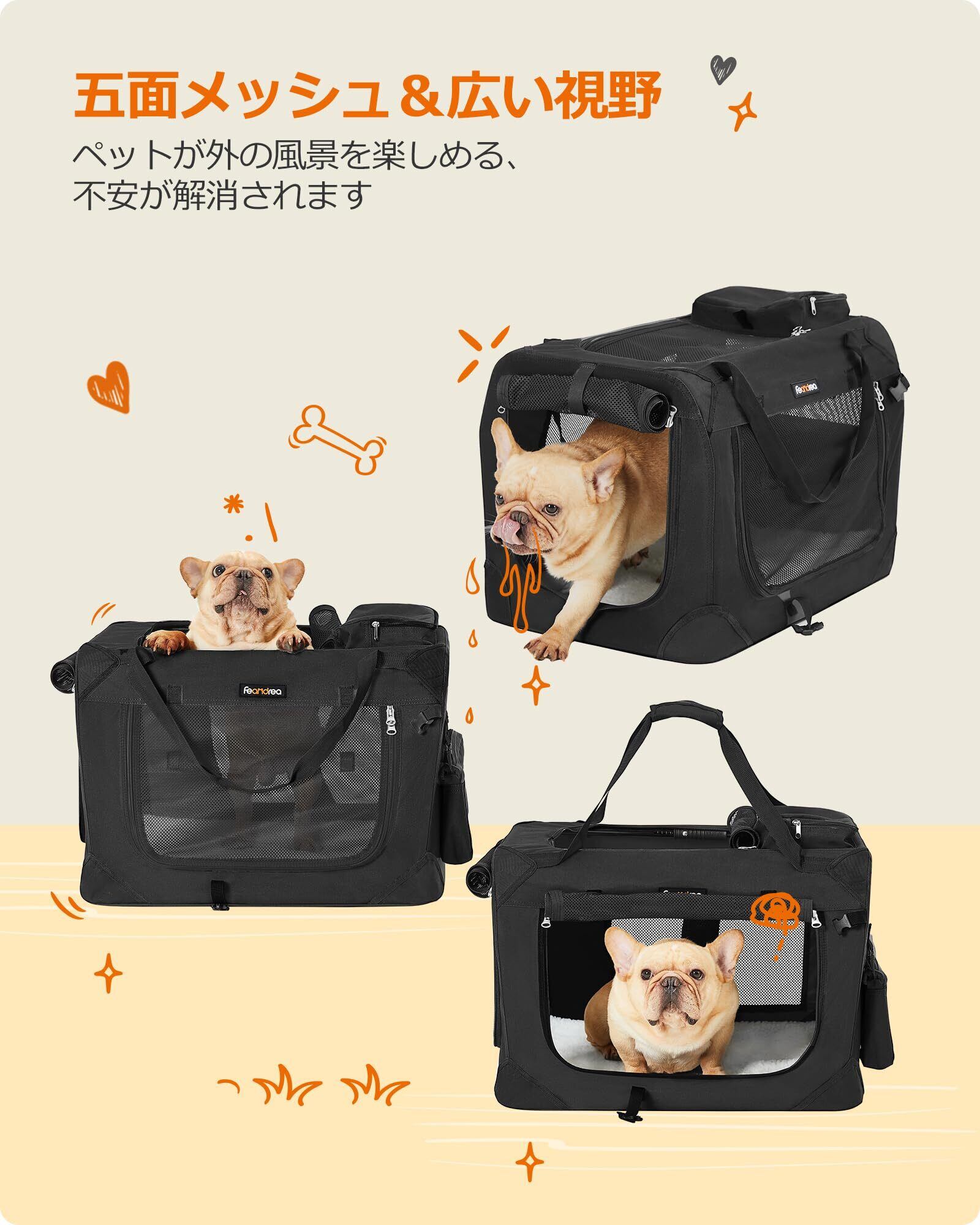 FEANDREA ペットキャリー 折りたたむ 変形しない犬用キャリー 4面メッシュ ブラック 60×42×42cm PDC60H
