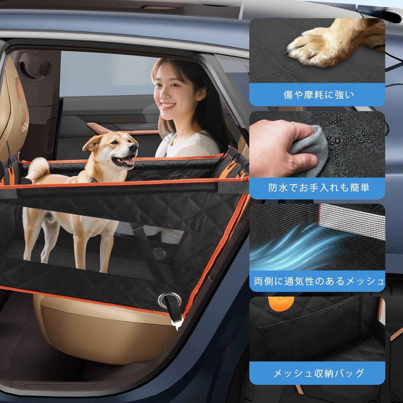 4、【高品質陽イオン素材製】防滑・耐傷・防水・防汚仕様で、ペットの爪や排泄物から車シートをしっかり保護。犬 ドライブベッドが汚れてしまっても、水拭きや掃除機で簡単にお手入れ可能。メッシュ通気サイドと滑り止め底面設計で、ペットが快適に過ごせる通気性を確保し、車内でも安定してずれにくい構造です。