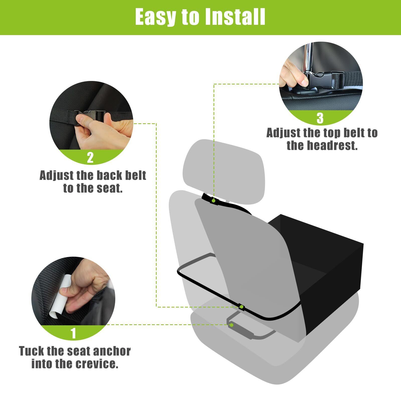 【簡単にインストール】犬用カーシートは簡単にインストールできます。数ステップで完了します。まず、シートを展開します。次に、シートアンカーを隙間に差し込みます。その後、ベルトをシートに調整します。最後に、トップベルトをヘッドレストに調整します。