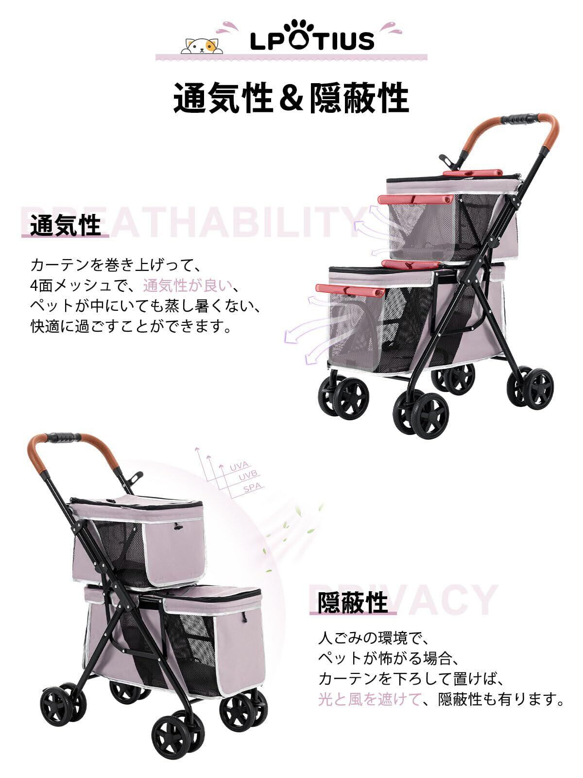 LPOTIUS ペットカート 多頭 上下2段式 ペットバギー ワンタッチ 折りたたみ 犬用ベビーカー コンパクト 収納便利 4輪 前輪360°回転 後輪ブレーキ付き 軽量 犬用カート 小型犬 中型犬 犬猫兼用 耐荷重20KG 上段8KG 下段12KG 多頭飼い対応 お出かけ 散歩 通院 介護用 ドッグカート 組み立て簡単(ピンク)