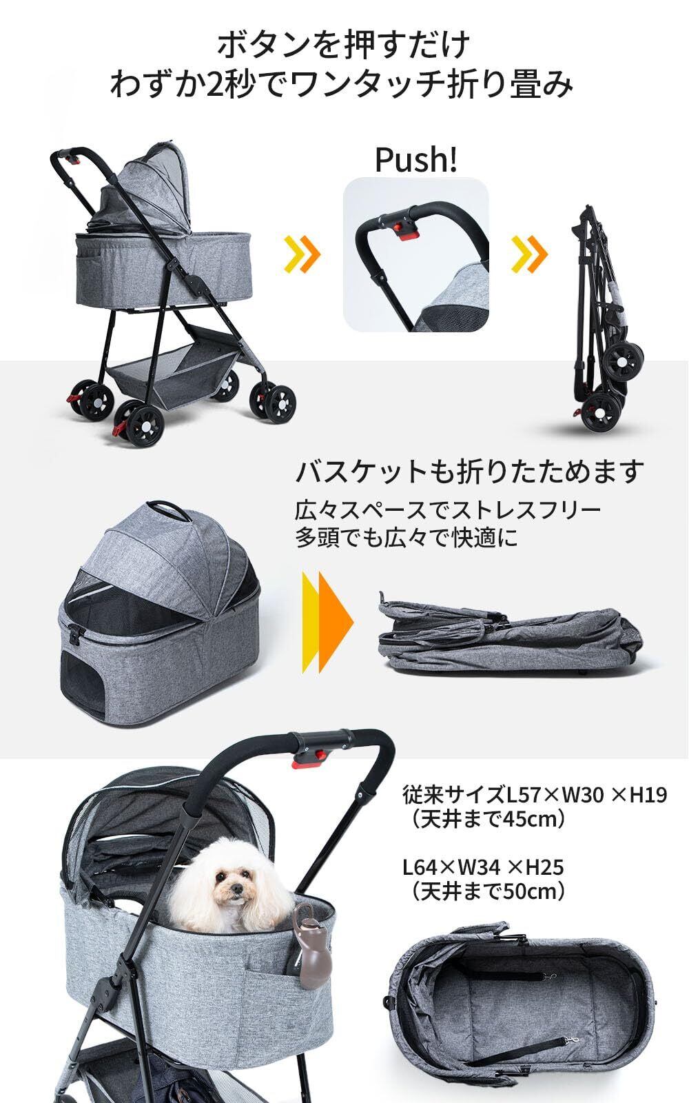 【利便性に富んだ機能性】 ワンタッチで簡単に自立型に折り畳めるデザインで、玄関や車のトランクにもすっぽり収まります。伸縮ハンドル付きで持ち運びも楽々で、旅行から日常使いまで幅広く活躍。わずか2秒で折り畳み可能で収納スペースを取らず、伸縮ハンドルでどこへでも楽々移動できます。収納バスケットと背面ポケットがあり、ペット用品からお買い物グッズまですべてを一手に管理できる便利さです。また、屋根の開閉が自由自在で、ペットの乗せ降ろしが簡単。ビューウィンドウ付きで飼い主とペットのコミュニケーションも取りやすく、出かけるたびに快適な時間を提供します。