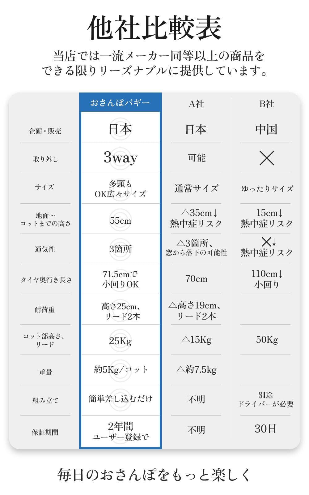【軽量でコンパクトな設計】 おさんぼバギーは、ベビーカーにも使われる高強度アルミフレームを採用しながら、耐荷重25kgを実現し、軽量化に成功しています。折り畳み式でコンパクトに収納でき、日々のお散歩がより快適で安心して利用できます。300Dオックスフォード生地と高強度PUタイヤにより耐久性と軽量性を両立し、大口径タイヤで振動吸収もバッチリ。使用時は幅49×奥行71×高さ101cmですが、折り畳み時はさらにコンパクトになります。全体をアルミフレームで組み上げ、重量わずか5kgの軽量ボディを実現。女性でもラクラク操作可能で、耐荷重25kgと多頭飼いにも対応します。
