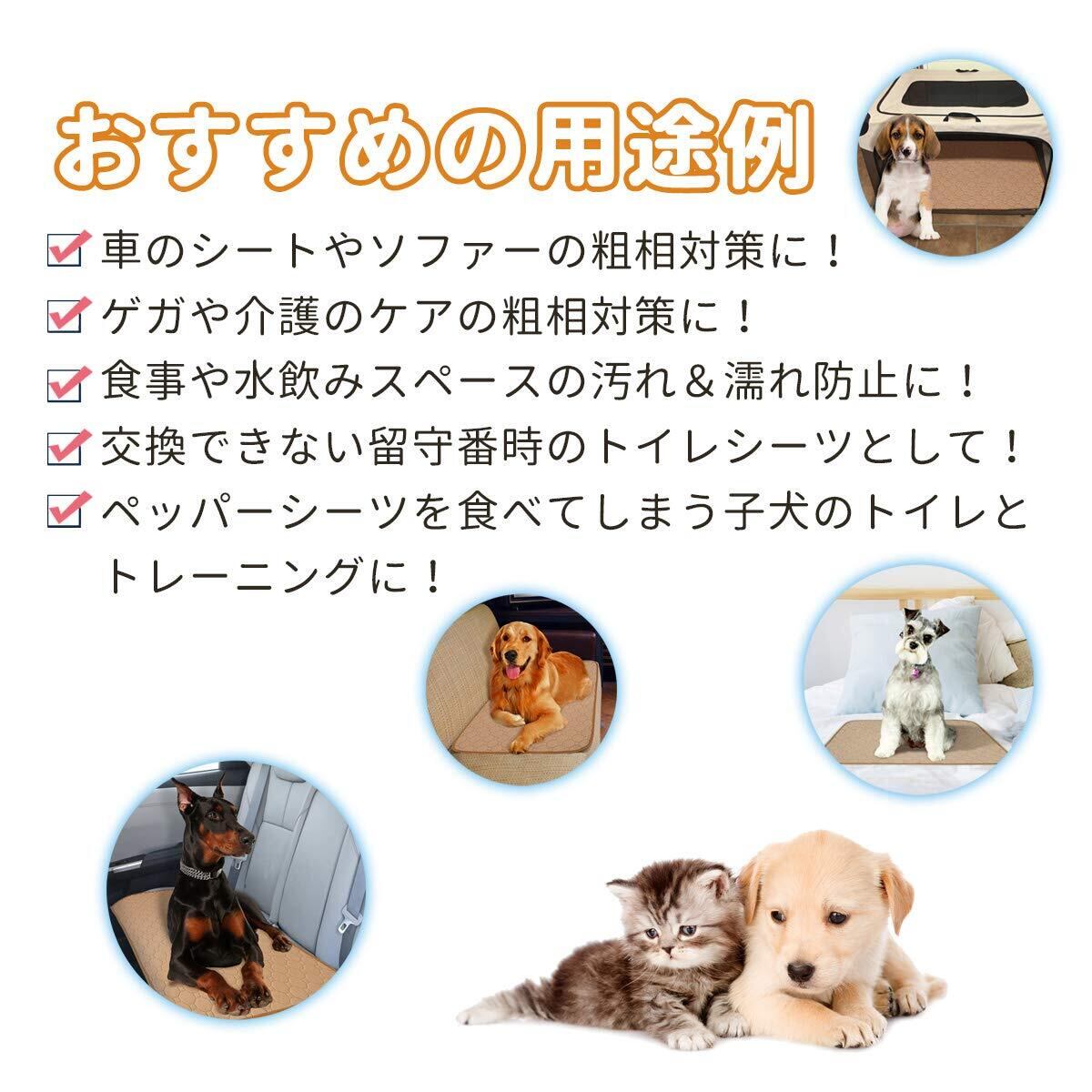 「幅広い用途」フローリングだけではなく、ソファー、ケンネル、キャリーバッグ、サークルやケージにも使え、車内の敷物としても素晴らしいです。食事や水飲みスペースの汚れ&濡れ防止に!交換できない留守番時のトイレシーツとして!様々な場面で活用できるペットシーツです