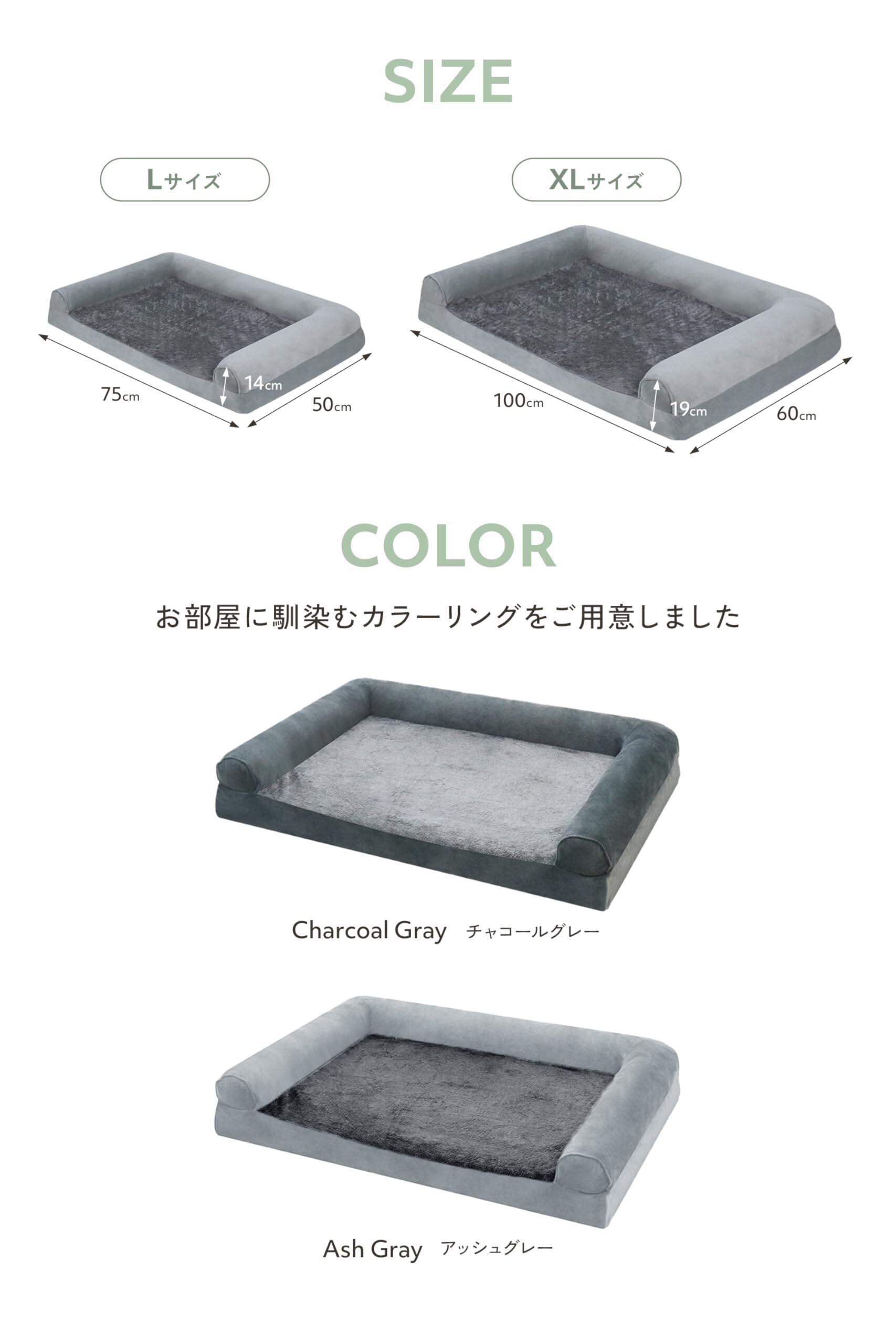 【おしゃれと実用性を兼ね備えた犬用ベッド】デザイン性と実用性を両立したクッション性のあるベッドです。お色はチャコールグレーとアッシュグレーをご用意。Lサイズは小型犬にもおすすめの犬用ベッドで、日常使いのペット用ベッドとして最適です!ベッドにはアゴ乗せ枕(クッション)付きで寝たきりのワンちゃんもラクな姿勢をとることができます。