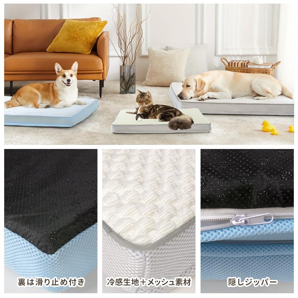 【夏の暑さ対策】ファッショナブルな3D冷感繊維が、ペットの体温を約5℃下げる効果を発揮します。通常のペットクッションよりも通気性に優れ、蒸し暑い夏を快適に過ごせます。触れると涼しさを感じられるマットは、暑さに弱い犬や猫の熱中症対策にも最適です。 ※速乾性と通気性で、ペットの健康をサポートします。