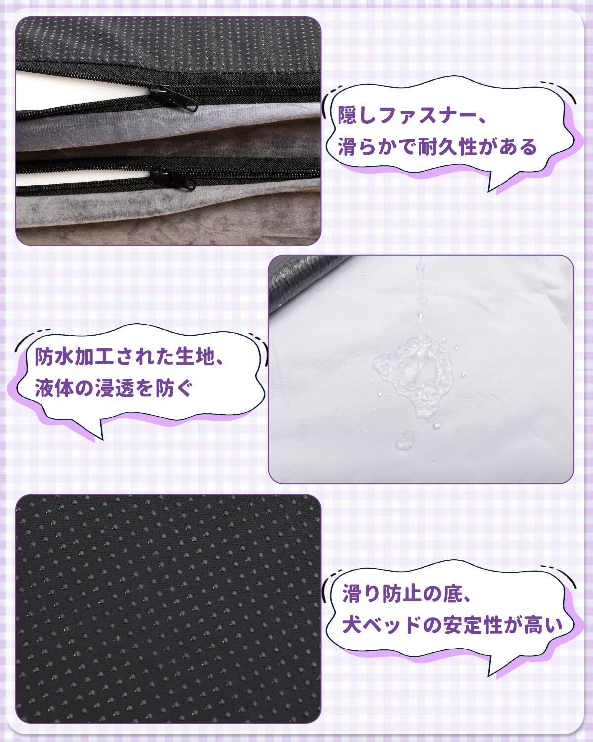 【防水と滑り止め】犬ベッドの睡眠エリアは3レイヤー生地ででき、表地は超ソフトで快適な生地で、肌にやさしいです。中間層のTPU防水層がペットの尿、汗などの浸透を防止し、内部のフォームを清潔に保つことができます。織物の裏地は、より強く耐久性があります。犬ベッドの底は滑り止め加工され、ペットが乗ったり降りたりする際にベッドが動くのを防ぐことができます。