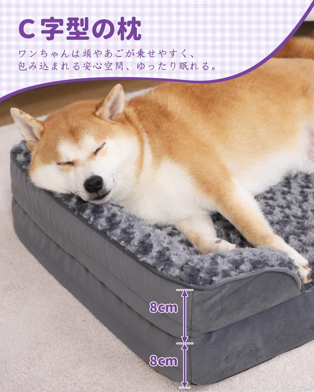【3面枕付きで快適な寝心地】このソファー型の犬用ベッドは3面に高反発の枕があり、包み込まれる安心空間、ゆったり眠れます。程よい8cmの高さで、ペットは頭やあご、前足が乗せやすいです。仰向けになっても、横向きになっても、犬ベッドの上に座っても、ペットは快適です。入り口部分が大きく、ペットの出入りも妨げられません。