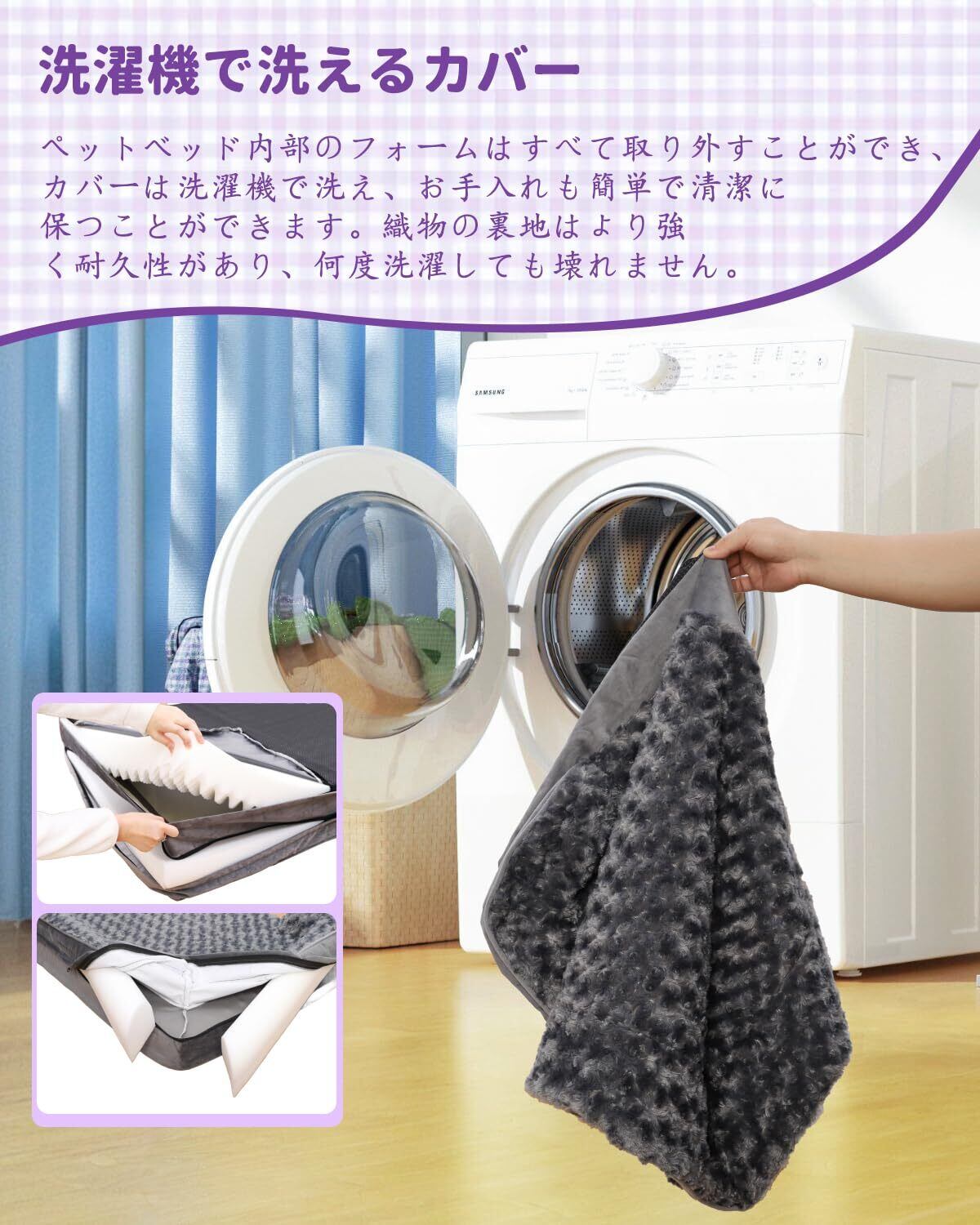 【洗える取り外し可能カバー】カバーは高品質なL字ファスナーとC字ファスナーを採用し、隠しジッパーで、床を傷つけたり、誤ってペットを傷つけたりする心配がありません。犬用ベッドの座面と3面枕のスポンジは完全に取り外すことができ、お手入れが非常に簡単です。カバーは洗濯機で洗え、アップグレードされた生地と補強された縫い目により、何度洗濯しても新品感つづきます。