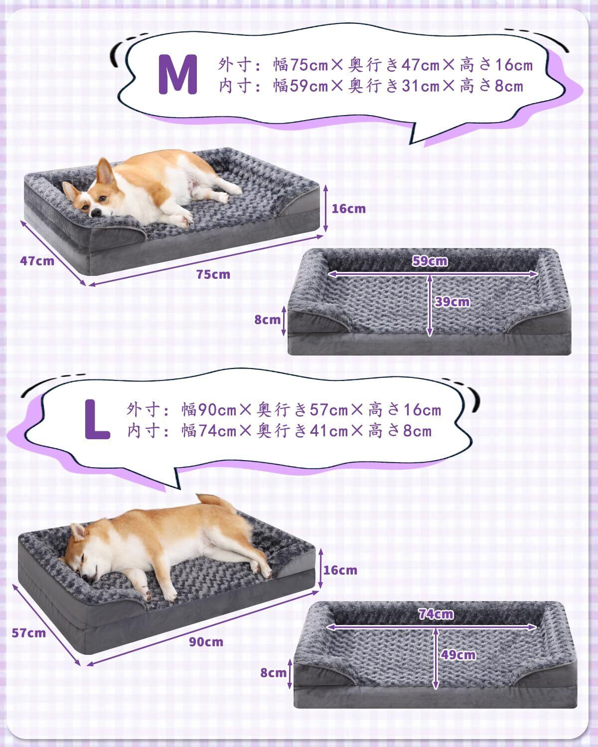【製品サイズ】パッケージ内容:エッグクレートフォーム×1、スポンジ×5、カバー×1、取扱説明書×1。製品サイズ:90×57×16 cm。睡眠エリア:74×41×8 cm。ペットベッドは真空パックされてお届けします。開封後、犬用ベッドが膨らむまで24~48時間放置してからご使用ください。商品が到着時に万が一破損・汚損また使用中にご不明な点がございましたら、お気軽にお問い合わせください。