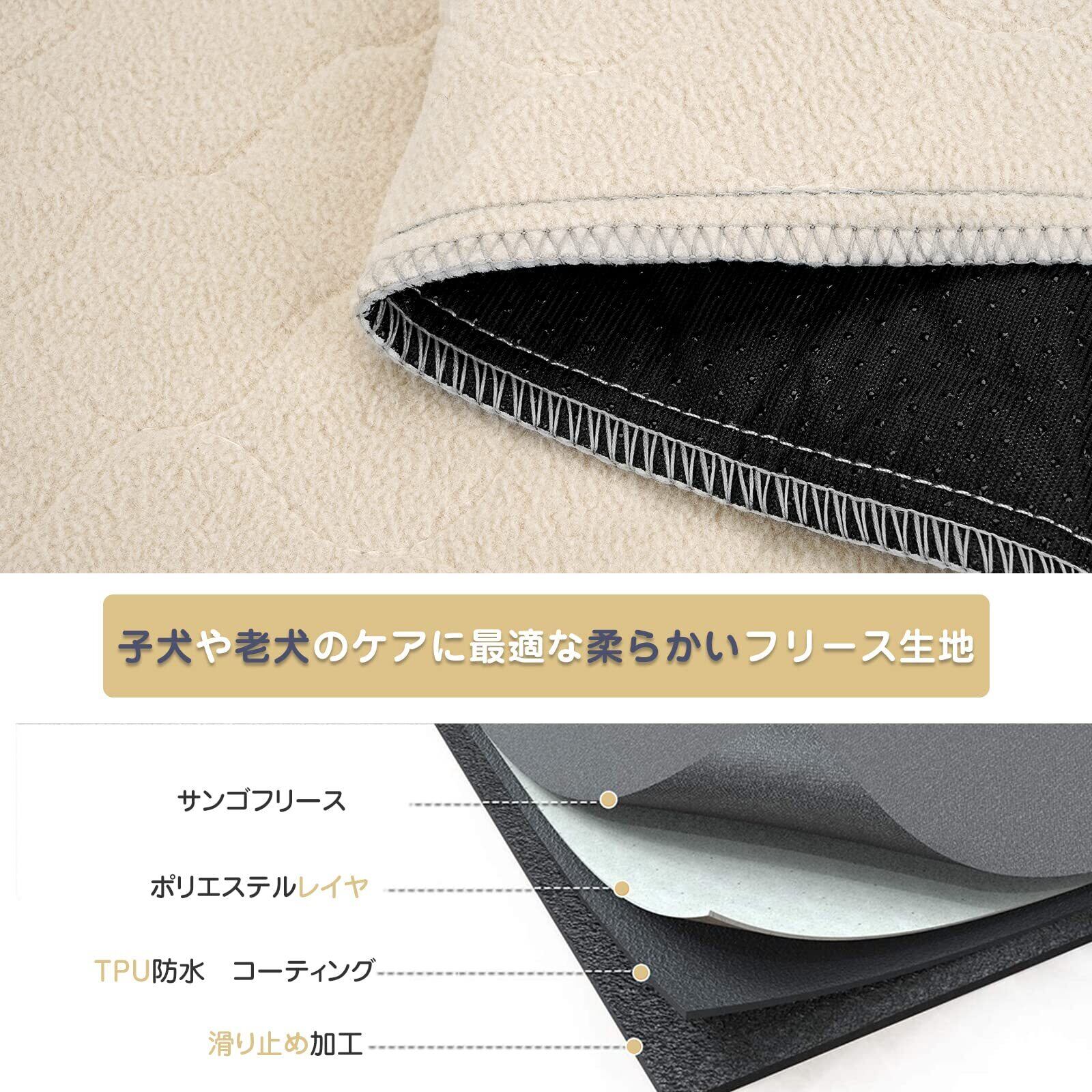 表地は子犬や老犬のケアにも最適な柔らかくて、吸水性の高いフリース生地。真ん中はポリエステルレイヤに防水コーティング。下に浸透する心配はありません。裏面はズレにくいノンスリップ仕上げ。滑りやすいフローリングでの転倒を防止します。ズレが原因の汚れから開放されます