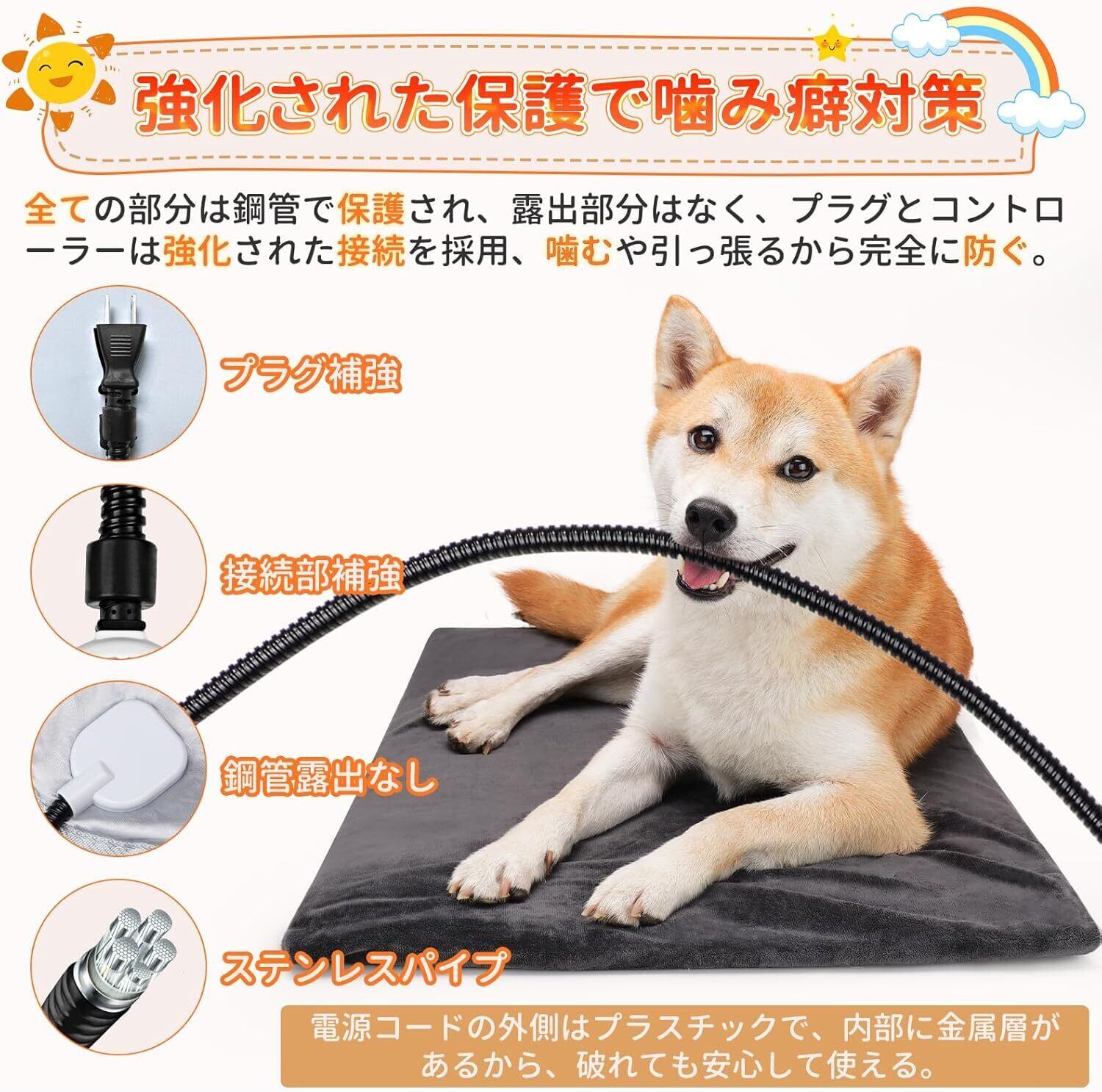 【噛み癖対策 &感電など多重保護 】全ての部分は鋼管で保護され、露出部分はなく、噛むや引っ張るから完全に防ぐ。接続部補強コントロラー補強全身鋼管保護で露出なしプラスチックなラセン管高品質電源コードで5重保護で全方位でペットの安全を守る。噛み癖と感電の危険が一切の心配がなし。