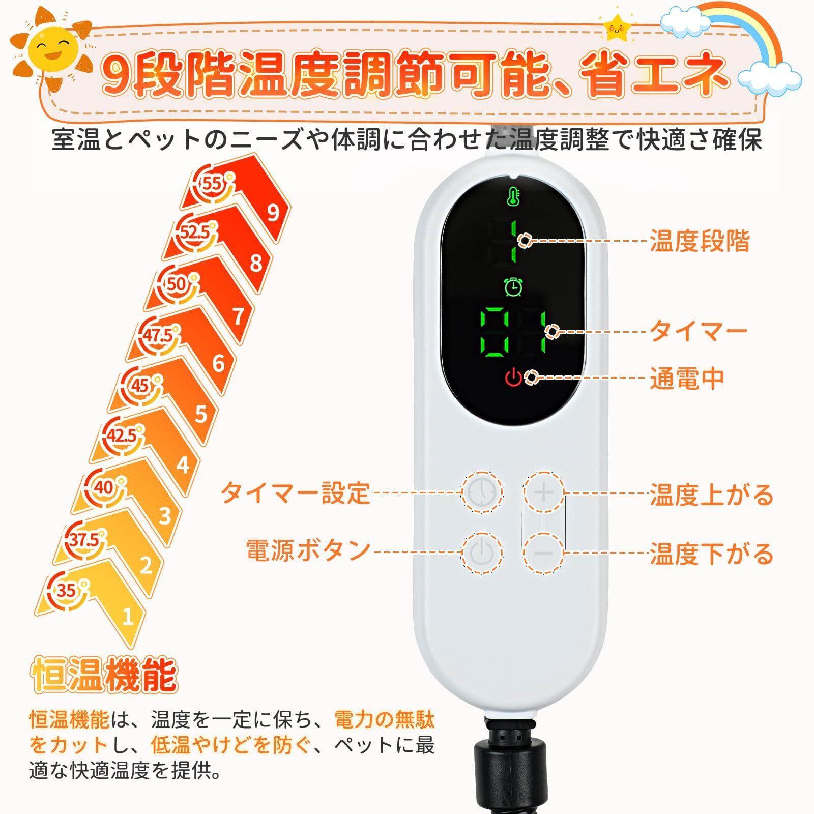 14段階タイマー機能・時間設定可能・常にオン可能, 9段階温度調節機能・前回設定記憶機能, カバー丸洗い可能・フランネル・カバー2枚, ペット専門家監修, 噛み付き防止・… 表示を増やす