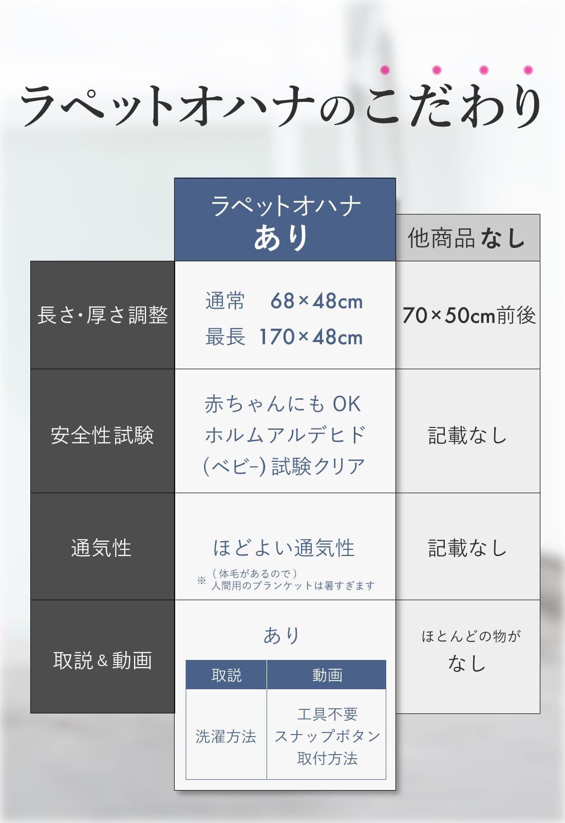 大事な家族に安全検査をしていない物を使えますか? 赤ちゃんの肌着と同じ検査で合格! 安全検査もしていない素材を使いたくない飼い主様のお声に答えました。 市場でブランケットに洗濯タグも付いていない商品もありました。 洗濯の方法と会社名をタグに入れるのは「家庭用品品質表示法」の法令を遵守したからです。