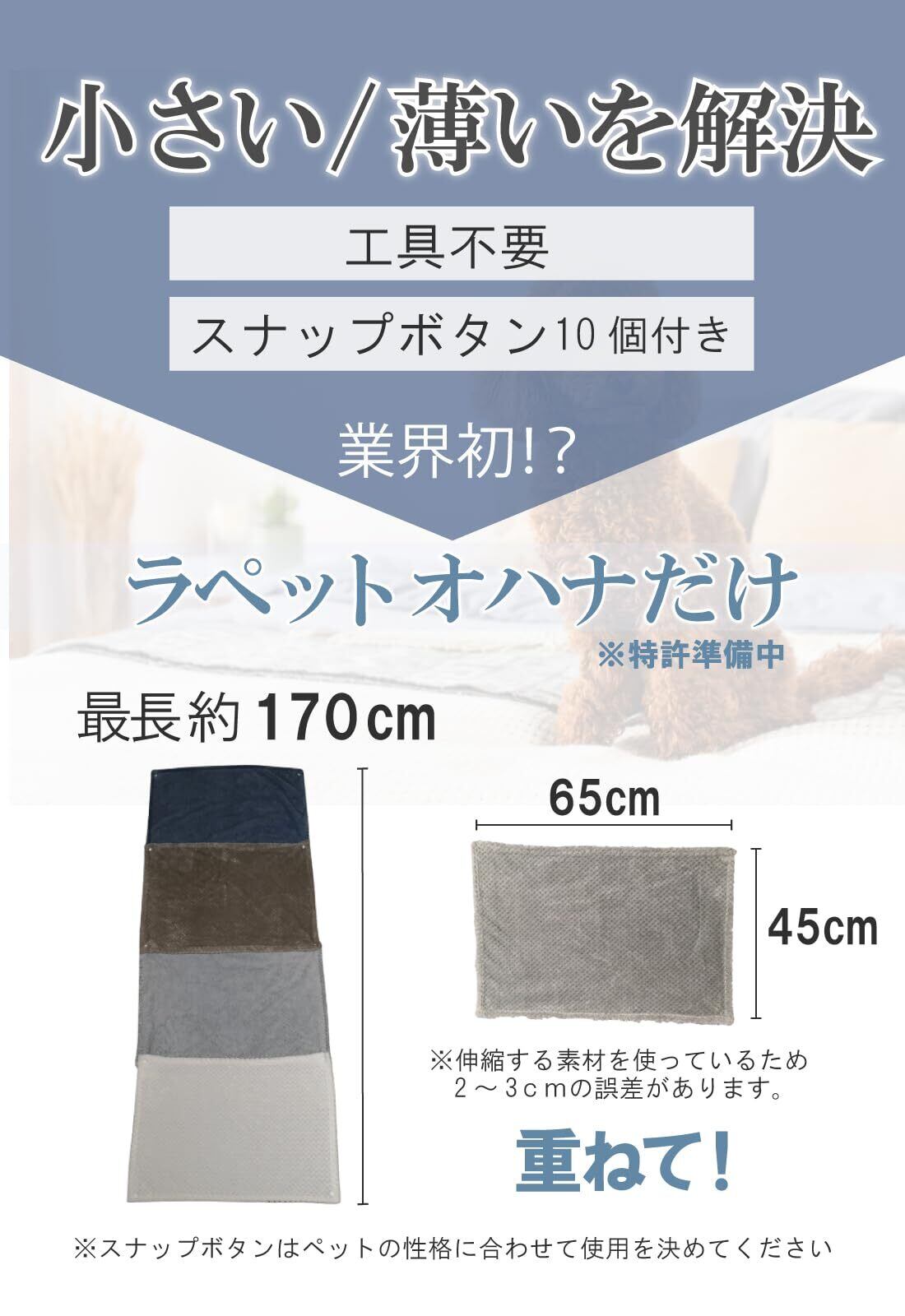 ペット 業界初!? スナップボタン 付きで長さも厚さも変えられる!ペットによって毛の長さは違うし暑がり寒がりも違います。 工具不要のスナップボタン付なので飼い主様の判断で長さも厚みも変えられるのでわんちゃん、ねこちゃんも快適